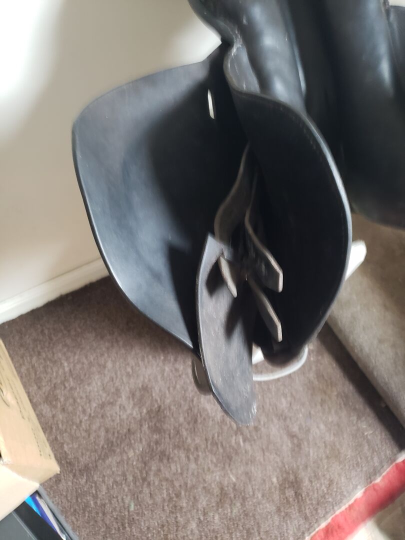 Dressage. medium fit, good condition. comfortable seat, black. Comes with matching leather girth. Absolute Bargain