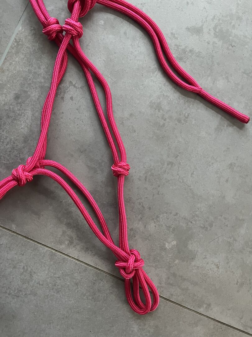 Knot Halter Pony Rosa - Till salu en knuten grimma för ponnyer i rosa som endast har använts 3-4 gånger! Den har inga skador eller fläckar! Frakt är 2,00€!