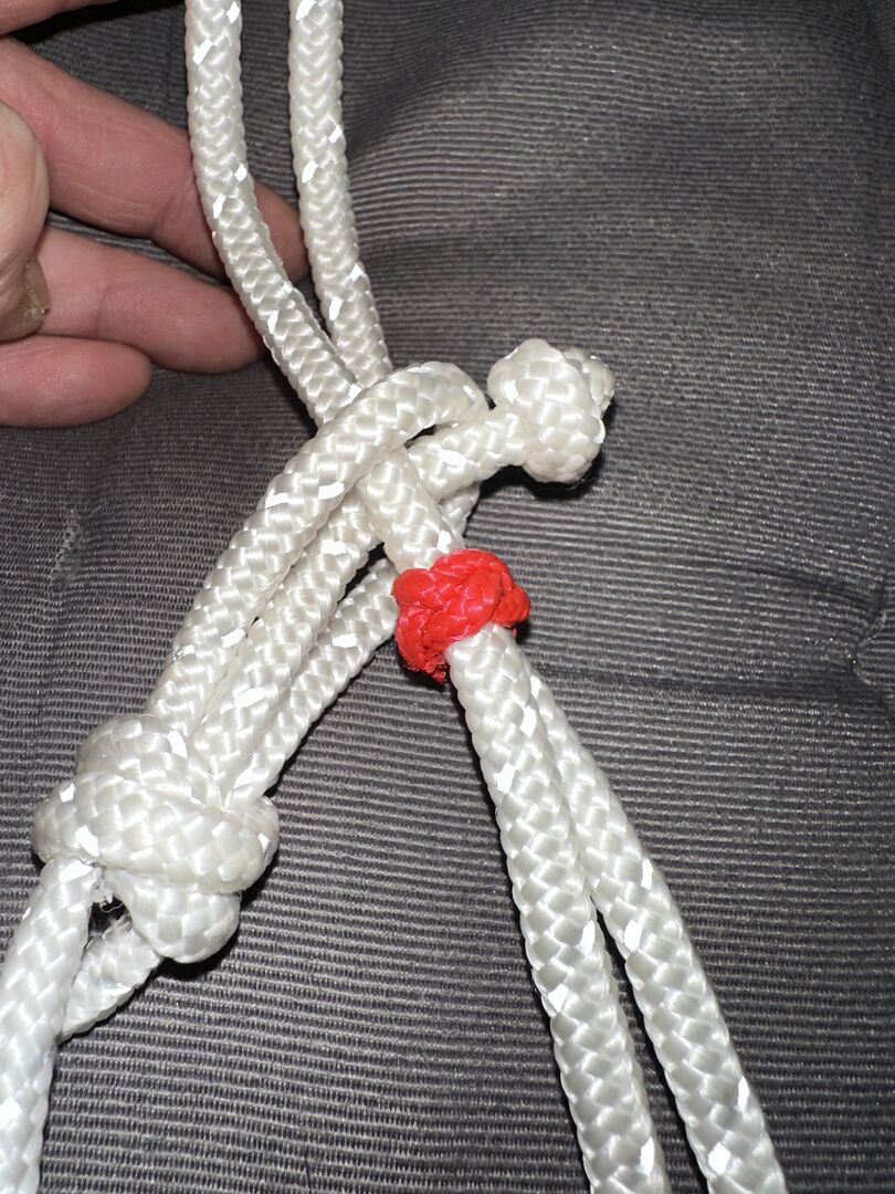 Med förenklad fästning. Den lilla röda knuten kan tryckas till rätt längd och sedan fästas på liknande sätt som ett bälte.