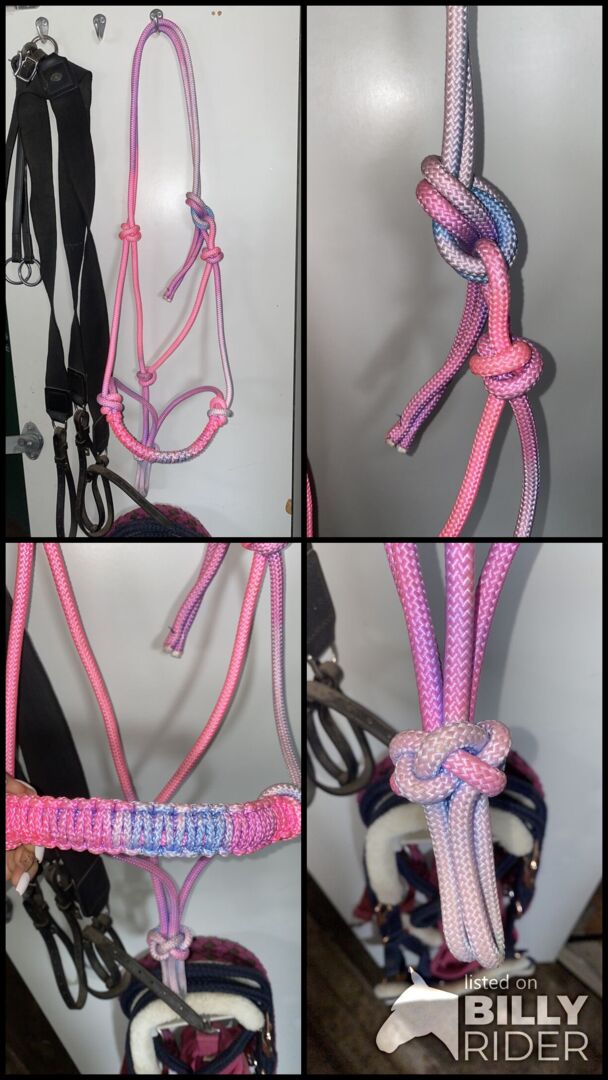Knutet halsband - Hej, till salu här är ett knutet halsband som har burits 1 gång i färgen candy och storleken ponny. Halstret säljs eftersom jag inte längre har en häst som passar till halstret.