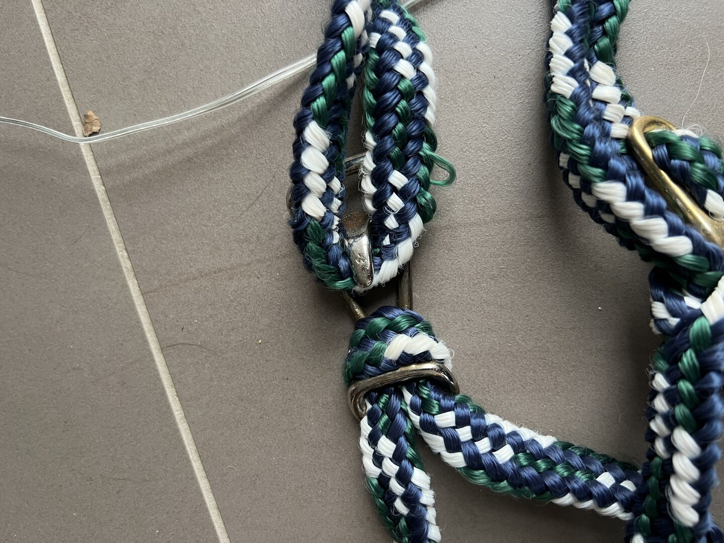 Knutet halsband - Jag säljer en blandning av en normal grimma och en knuten grimma. Denna grimma är hakad på spännet och inte knuten, men består fortfarande av löst och justerbart rep. Grimman passar hästar Cob-WB