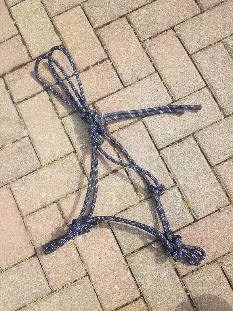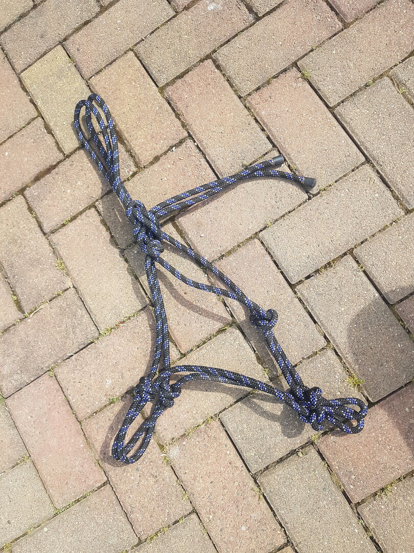 Knutet halster används sällan - Det knutna halstret motsvarar storleken på ett varmblod och är blå/svart. Tyvärr är den för stor för min häst och har bara använts ungefär 10 gånger.