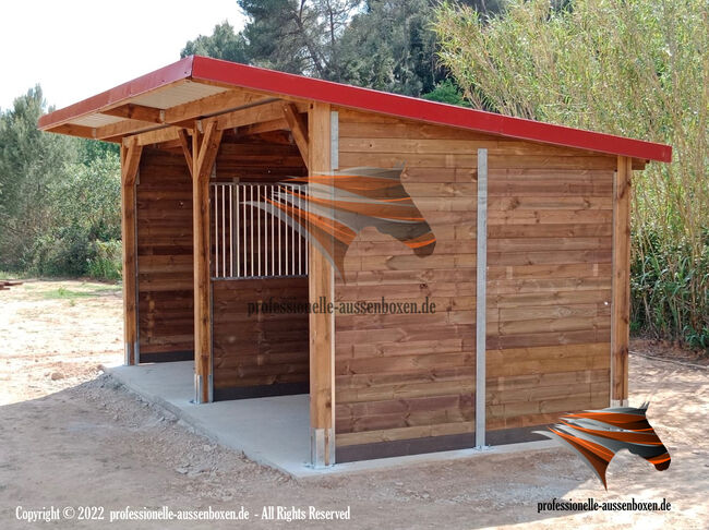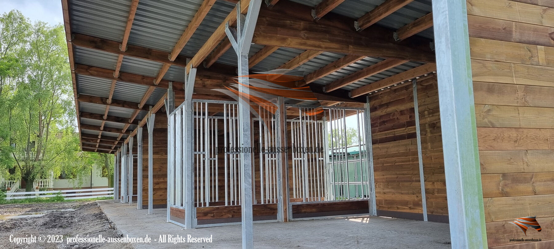 AUSSENBOXEN erbjuder högkvalitativa skydd och tak för hästar, idealiska för beteshagar, paddockar och utfodringsområden.