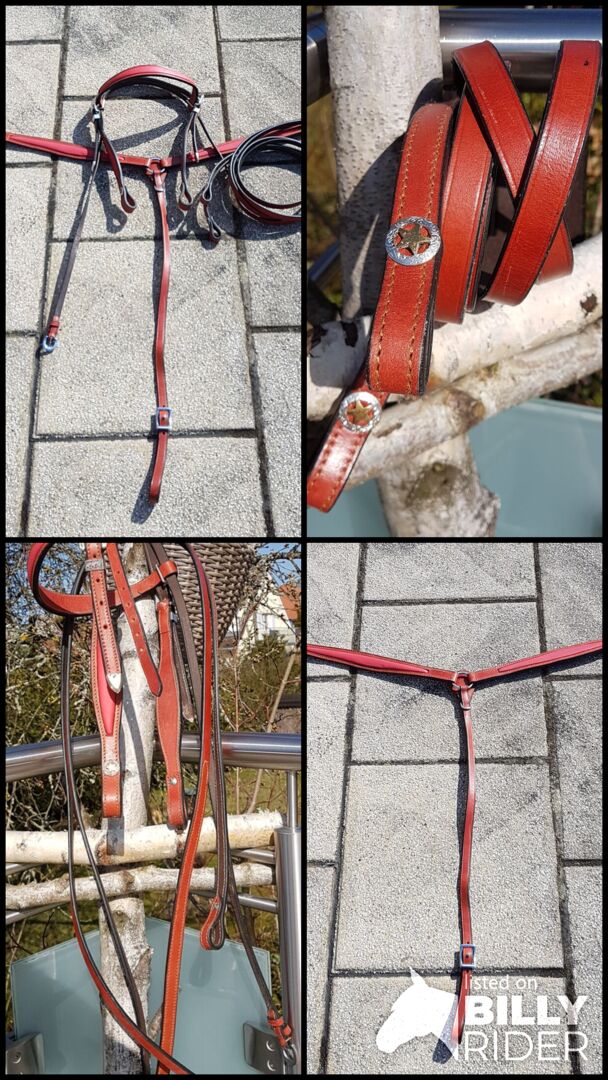 Kombination träns / tyglar / bröstplatta Western Leather, slät, röd/brun - Här erbjuder vi en sällan använd westernkombination bestående av träns, tyglar och bröstplatta! Allt är samordnat. Läder av god kvalitet, fortfarande lite styvt, eftersom det är praktiskt taget nytt! Jag fick den i julklapp, men jag kan inte värma upp för den trots att jag har provat den (häst!) .... Vackra röda läderinlägg, dekorativa spännen, storlek varmt blod. Självklart kan du justera den.