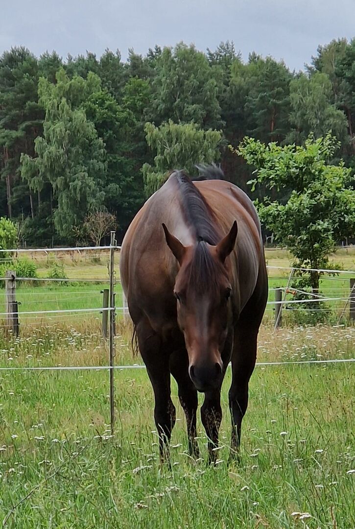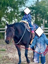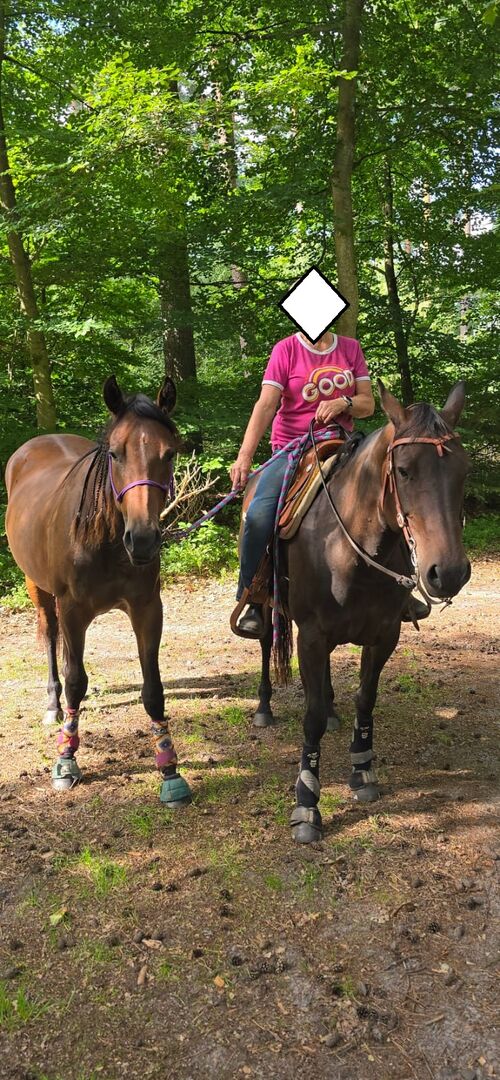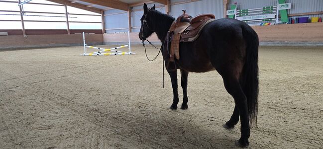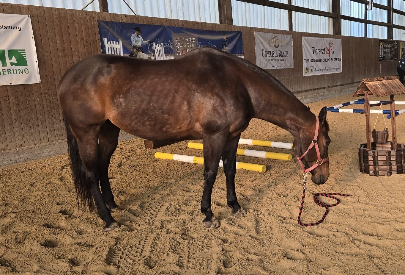 Sally är ett vackert, kompakt och starkt Quarter Horse-sto, född 2011, med en mankhöjd på ca 151 cm. Det brunfärgade stoet har pass, men inga papper. Hon imponerar framför allt med sin härliga, människoorienterade karaktär. Sally är känslig, mycket väluppfostrad och alltid hanterbar. Stoet älskar barn, vet hur man hanterar barn och är därför också mycket lämplig för ungdomar. Hon lär sig snabbt och är mycket mångsidig. Sally bor för närvarande i ett öppet stall i besättningen i robust djurhållning. Men hon är också bekant med boxuppstallning, betesmark, skog, diken och olika vardagssituationer. Hon är mycket vänlig i flocken och kommer även bra överens med valacker. Hon är också lätt att mata och kan lämnas ensam när som helst. Hon är vid god hälsa. Sally är regelbundet vaccinerad och avmaskad. Hon går för närvarande barfota och rids med hovstövlar på fältet. Hon är säker i terrängen, kan rallyn och kan lastas på några sekunder. Sally har mycket bra västerländsk träning i riktning mot allround, särskilt i ranchridning och ranchskena. Hon har redan visats framgångsrikt och är också lugn och okomplicerad på utställningar. Hon har också varit i professionell träning i fem månader och har fått löpande lektioner. Med sina goda rörelser, sin balanserade natur och sin mångsidighet är Sally den perfekta partnern för ambitiösa fritidsryttare som uppskattar variation i sadeln. Samtidigt är hon också ett utmärkt val för ungdomar som letar efter en pålitlig och välutbildad häst. To the seller's offerlaunch