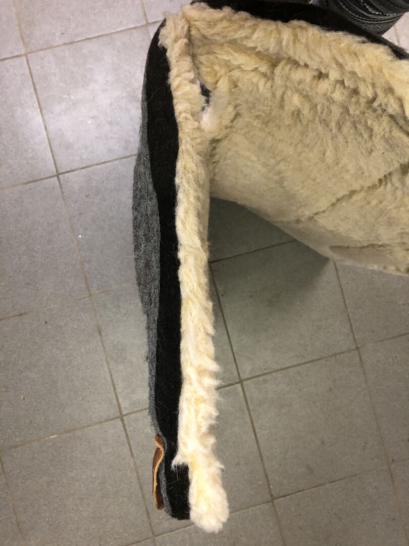Korrigeringspad Western, filt/vilts, 30 tum - Säljer Western Correction Pad, vadderad på framsidan av axeln för att kompensera för saknade muskler (perfekt för seniorer/unga hästar/återuppbyggnad). Det är en mycket högkvalitativ pad med filt på ovansidan, fleece på undersidan och utskärningar i lädret för bättre benkontakt. Längd 76 cm (30 tum) och ca 2,6 cm (1 tum) tjockt. Jag köpte den som en Mustang Saddlery Correction Pad Barrel with Fleece Lining. Den liknar också BioFit från Classic Equine eller orthoridkorrigeringskudden från Southwestern Equine. Fleecen är fortfarande fin och fluffig och sitter inte ihop, den har bara blivit lite missfärgad på vissa ställen.