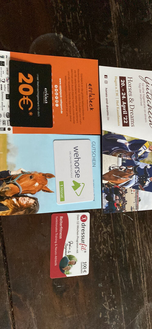 Kuponger - Några kuponger till salu. Ge prisförslag för varje kupong. - Dressurfit värt 100€ - wehorse värd 24,90€ - Hästar och drömmar biljett - epplejeck värd 20€