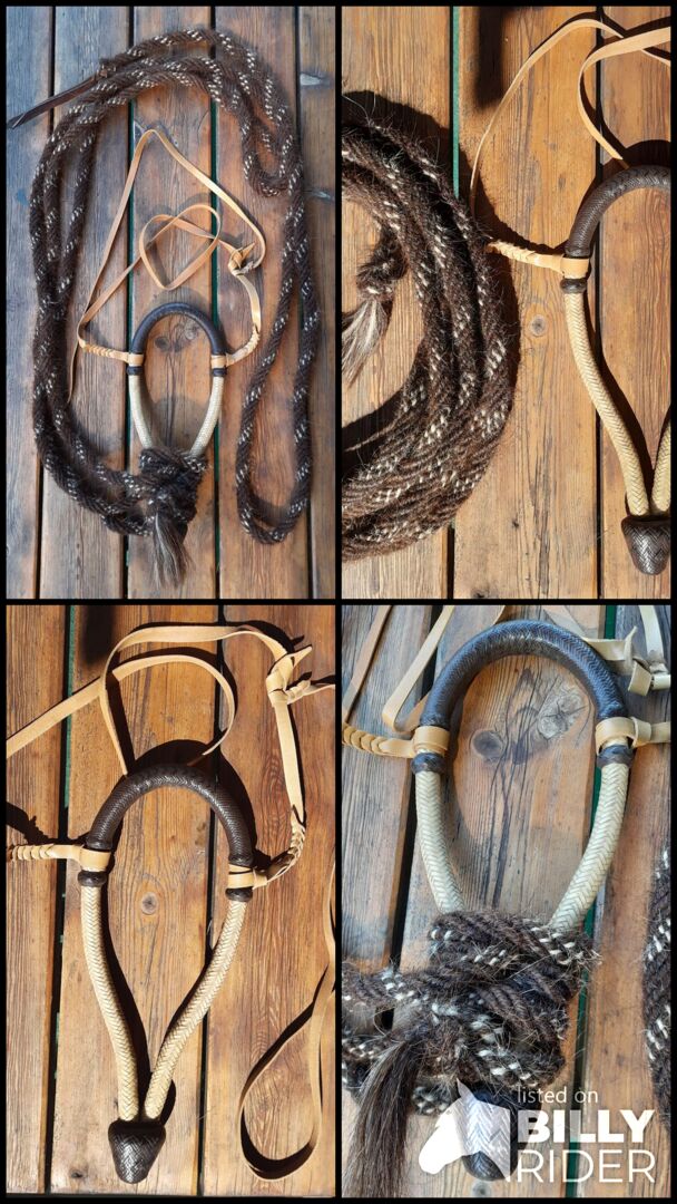 Kvalitet som ny bosal set 3/4" för 58/59 nos - Bosal: mjukare medium flex, sidor av ljus råhud 3/4" tjock, nosstycke av känguruläder flätat mörkbrunt med svarta mellanvågor, 7/8" tjock insida vid nosen något platt, längd 19cm, små knutar, invändig omkrets 72 cm; USA-import, tillverkare osäker, möjligen Dale Chavez, men hög kvalitet på utfört arbete. små tecken på slitage eftersom endast används för en kort tid, inga skador Mecate: 6plait manhår, mörkbrun / naturlig, fin mjuk kvalitet, USA-import; som ny, inga skador Hängare: mjukt ljusbrunt läder med tieback