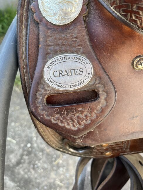 - Varumärke: Crates - Mörkbrunt läder med dekorativ prägling - Bekvämt, djupt western-säte - Rejäla fendrar och stigbyglar ingår - Läderfinish av hög kvalitet - Klassiska silverkonchetter som dekoration