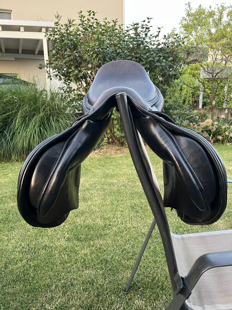 Färg: svart med brunt säte Sits: 17,5" och mycket mjuk Ålder: 2015 Sadelns nummer: 15016 EC Sadelklaff: Kort Knärullar: Små Dynor: Med reserv Remsor: Tre stycken Kammarbredd: Original 25 - anpassad till en något bredare manke