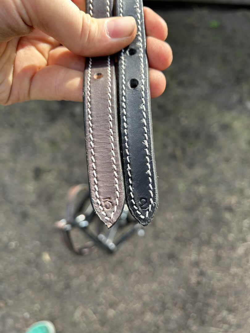 Den svarta lädergrimman: Huvudstycke 40,5 cm långt Kindstycke 9,3 cm långt (från ring till ring)