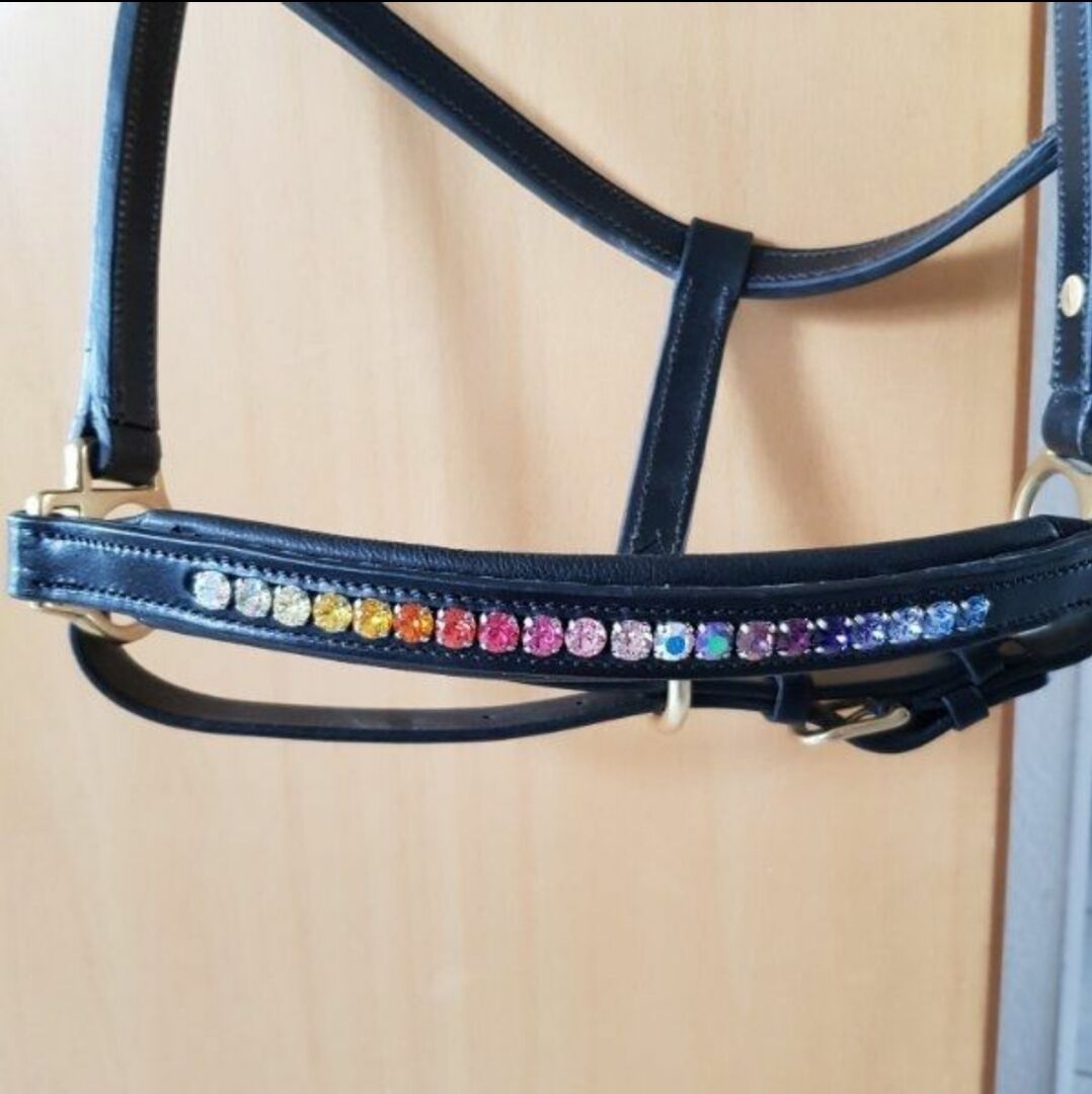 Läderhalsband - Läderhalstret är nytt och var bara på hästen för fotot. Det är ett mycket fint halsband, stenarna är inte limmade utan sydda. Tyvärr passar den inte min häst. Den skulle passa en liten häst med smalt huvud eller en ponny. Jag betalade 80 euro för halstret.