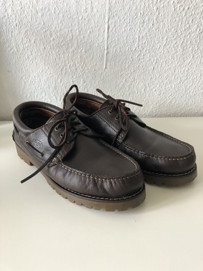 Läderskor storlek 43 - Hej, Jag säljer en fantastisk och chic lädersko. I storlek 43, lite slitna, små spår av användning, skorna är rengjorda och vårdade med läderbalsam. En klassisk moccasin i bästa läderkvalitet och utförande. Med läderfoder, läderförstärkning och omgivande skosnöre.
