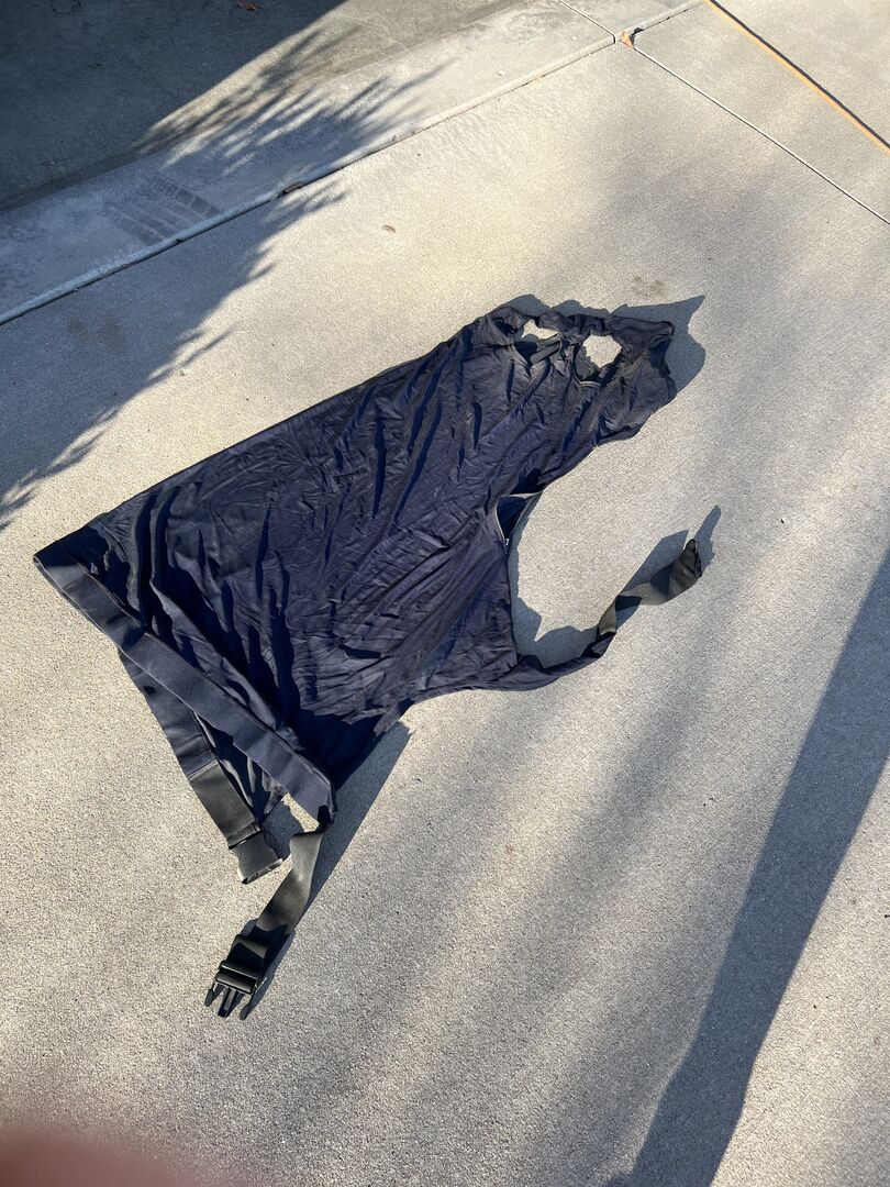 Large Navy Sleezy. Buckle closure along the belly and zipper closure around the neck. Laundered but does have slight residual hair.