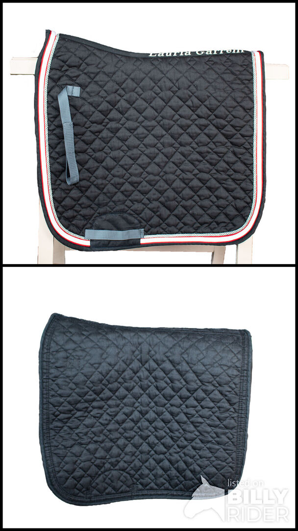 Lauria Garelli Saddle Pad Black DR - Ett vackert och högkvalitativt dressyrsadelunderlag från företaget Lauria. Sadelunderlaget visar tecken på användning, men är generellt sett i mycket gott skick. Den fantastiska svarta sadelunderlägget med röd och vit kant är ett riktigt blickfång under sadeln. To the seller's offerlaunch