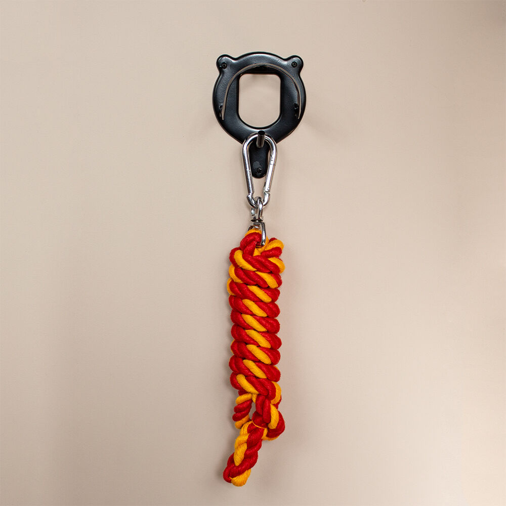 Ledningsrep med karbinhake röd/gul - Det vackra röda och gula repet är särskilt slitstarkt. Ledarlinan i färgerna rött och gult är ett riktigt blickfång. Den har en silverfärgad karbinhake. Repet visar tecken på användning, men är i gott skick. To the seller's offerlaunch