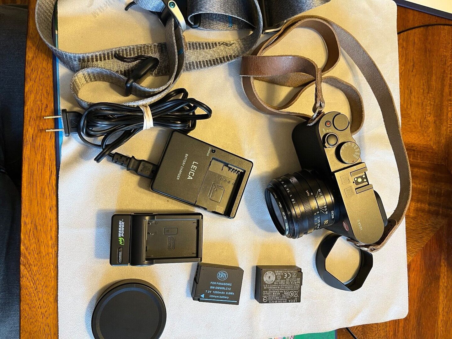 Leica Q 24MP - Svart i mycket gott skick med tillbehör - Detta inkluderar den ursprungliga kameran, batteriet och laddaren samt det ursprungliga motljusskyddet och linsskyddet. Alla dessa saker är i mycket gott skick med minimala repor och inga bucklor eller andra brister som jag kan se (se bilder - den är i mycket bättre skick än de flesta begagnade Qs på marknaden). Jag kommer också att inkludera ett Hoya UV-filter (förmodligen värdelöst med motorhuven, men jag gillar att vara försiktig) samt ett tredjeparts batteri och laddare, ett Sandisk 64GB SD-kort, en handledsrem med avancerad design samt en personlig Clever Supply Co. läderhandledsrem.