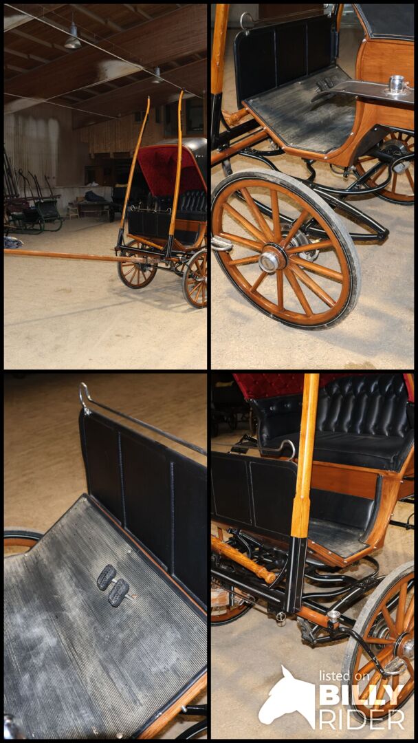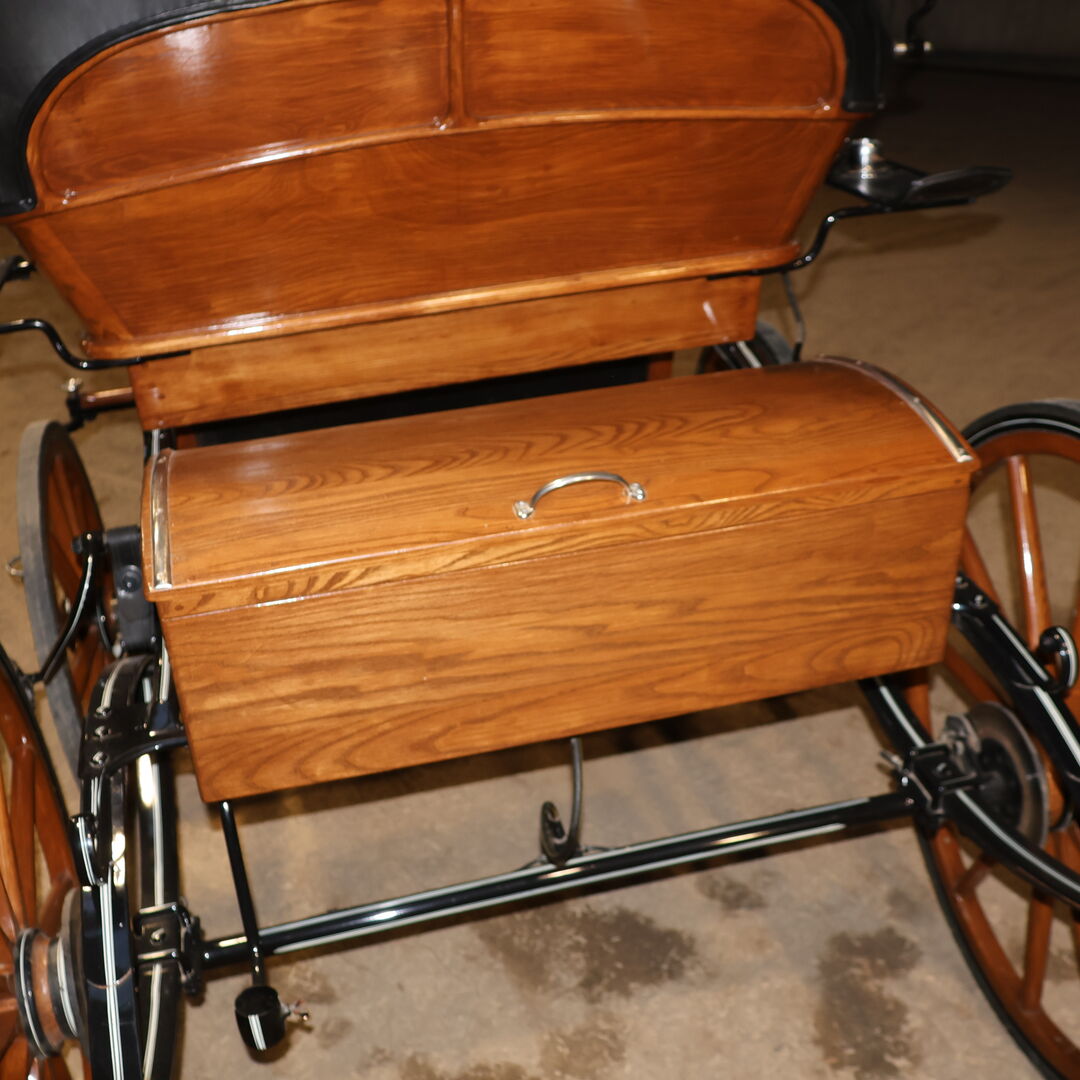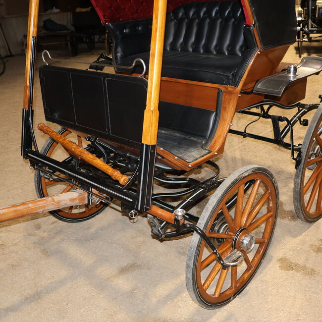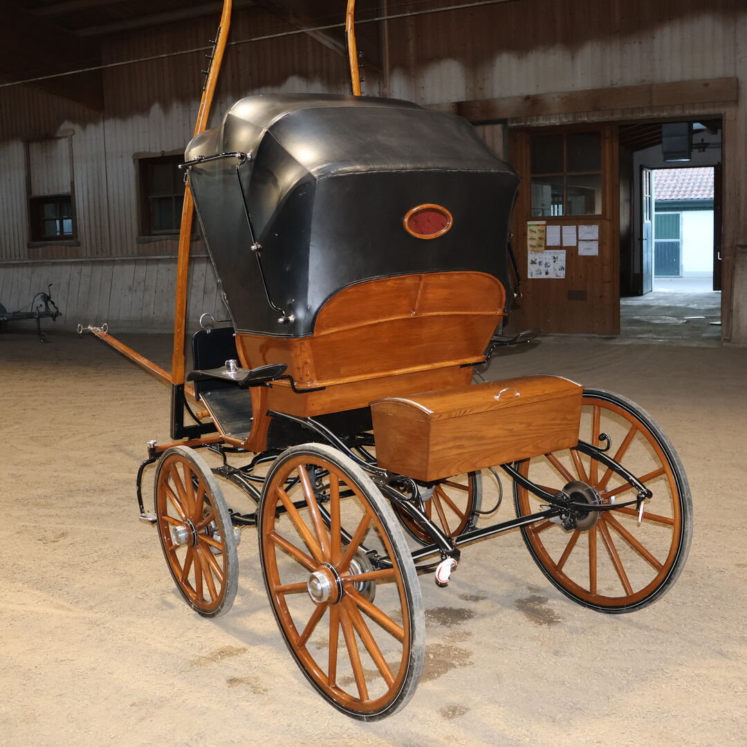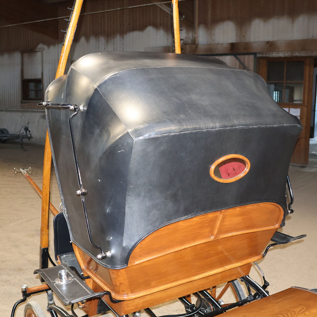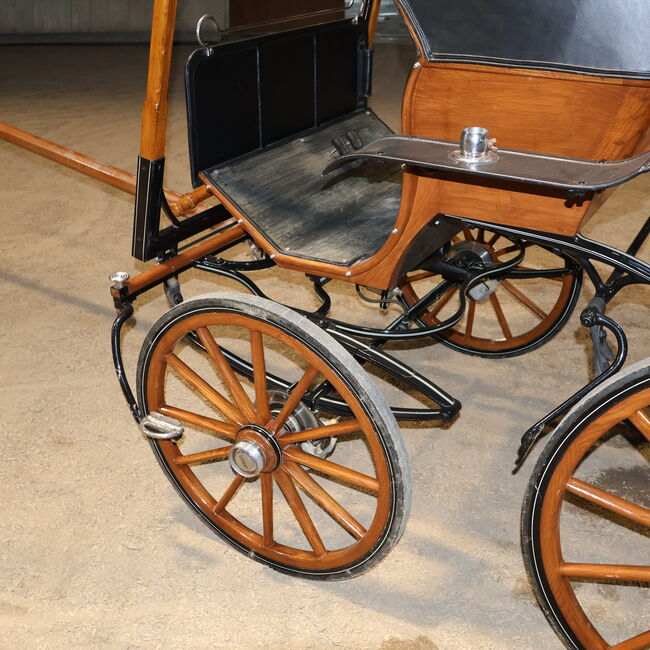 Varumärke: Leitert Typ av vagn: Läkarvagn Hästtyp: Stora hästar Skick: Mycket gott skick (trä i toppskick, klädsel och sufflett i toppskick) Färg: Naturligt trä med svart kåpa (rött tygöverdrag inuti) Omfattning av leveransen: Se bilder