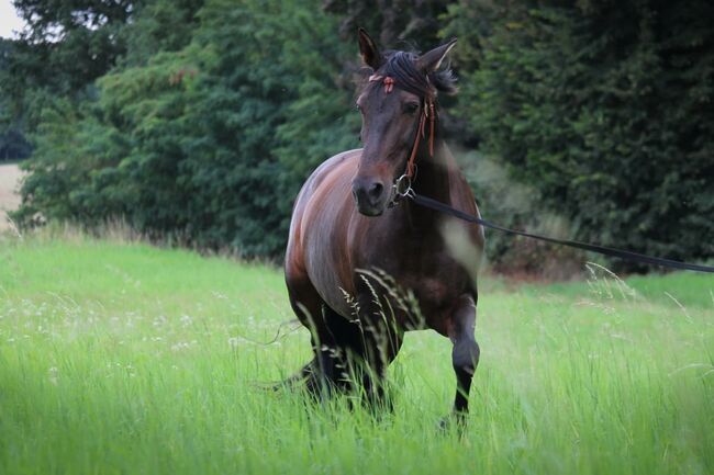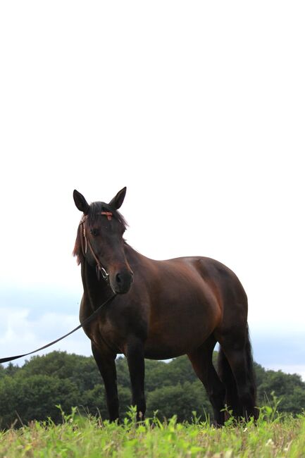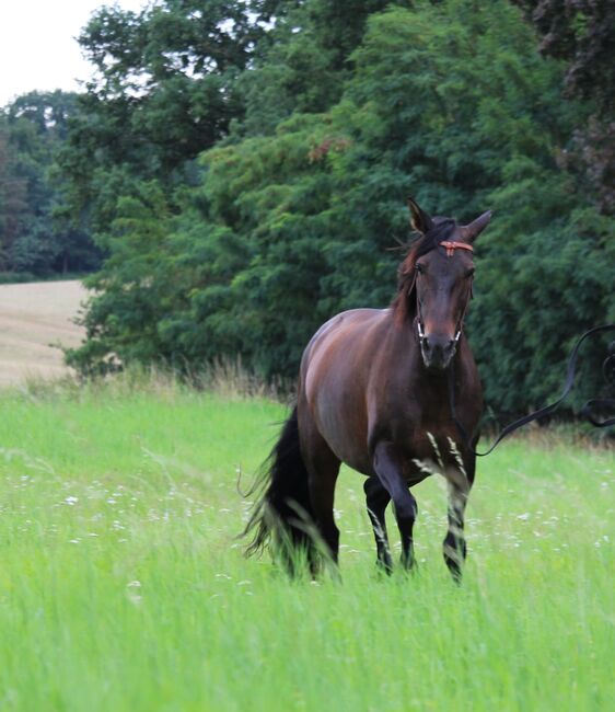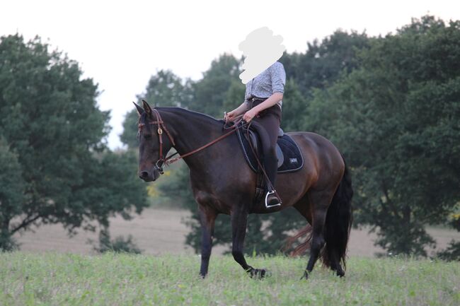 En vacker mörkbrun Cruzado-sto med en höjd av cirka 162 cm är till salu. Hon imponerar med sin korrekta, kompakta konformation, goda hälsa och trevliga natur. En AKU från 2024 är tillgänglig. Colina är barfota, regelbundet avmaskad och vaccinerad och är van vid att hållas i en box med paddock samt att beta 24 timmar om dygnet på sommaren. Stoet är för närvarande något överviktigt på grund av en mycket rik hö diet. Karaktärsmässigt är hon en riktig hjärtehäst: mycket söt, människoorienterad, vänlig och öppen mot människor och hästar. Colina är känslig, intelligent, ivrig att lära sig och intresserad av nya uppgifter. Hon lär sig nya saker snabbt och arbetar alltid motiverat. Under sadel imponerar hon med sina mycket mjuka och behagliga gångarter. Stoet har arbetats på många olika sätt och är en riktig allroundhäst. Hon är uppfostrad i westernstil och behärskar redan bridge, pole work, sidepass och andra element. Hon genomgår för närvarande vidareutbildning i klassisk ridstil och lär sig bland annat att luta sig in, axla in och gångartsförstärkning. På grund av hennes nuvarande utbildningsnivå är hon ännu inte lämplig för nybörjare. Även om hon kan ridas av oerfarna ryttare, behöver hon ryttarens stöd med böjning och lektionerna. Hon är avslappnad när hon rids i grupp, men är fortfarande lite försiktig på egen hand. Hon passar perfekt för en känslig, lugn och erfaren ryttare som tycker om att träna henne vidare och uppmuntra henne regelbundet. Med sin kärleksfulla natur och stora potential är hon en riktig drömhäst som väntar på sin perfekta matchning.