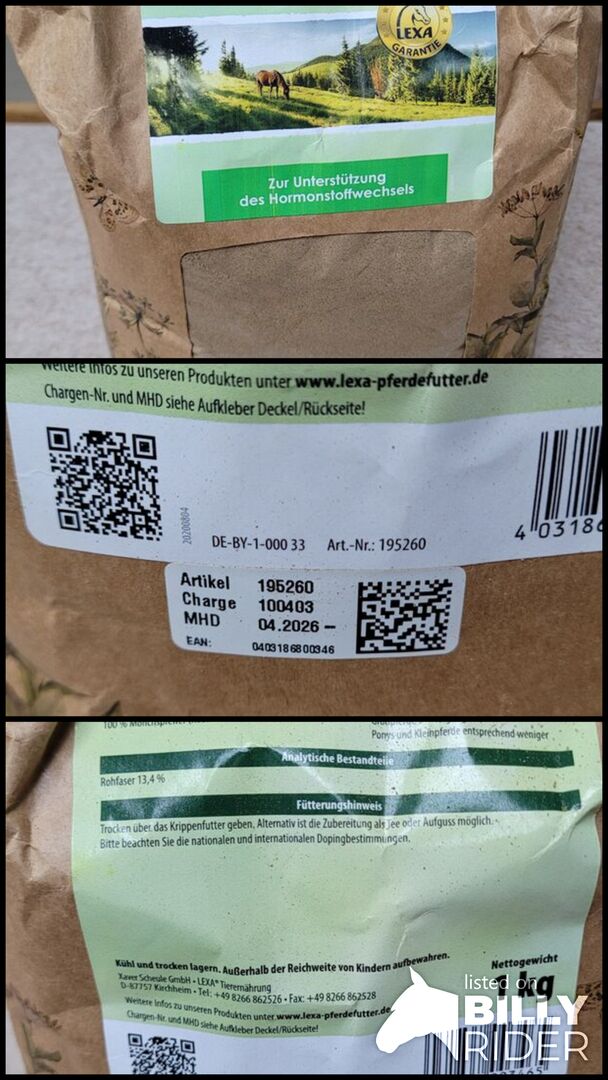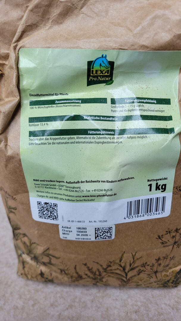Lexa munkpeppar mald 1 kg - Öppnad 1 kg förpackning av munkpeppar (mald) från Lexa för hästar. Endast ett fåtal portioner har tagits bort, så förpackningen är fortfarande så gott som full. Förvaras mörkt, svalt och mörkt. Bäst före april 2026.