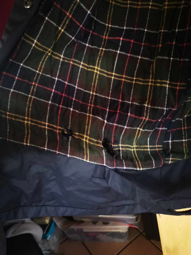 Mackintosh - Rocken är begagnad och i gott skick. Tyvärr har jag just sett att de snälla mössen har gjort två hål i fodret på höger ben. Se bilderna.