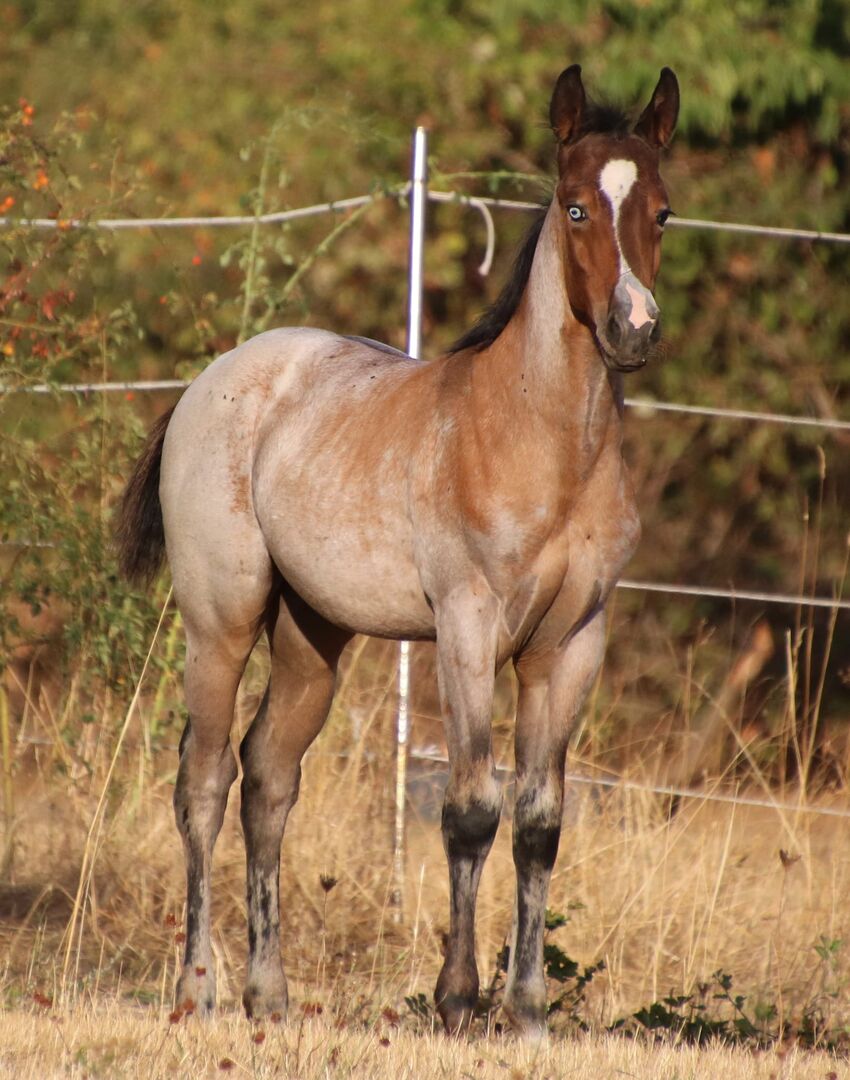 mänsklig ögonfångare (Paint Horse föl) - Den här förtjusande, mycket välbyggda Paint Horse-fölet vill erövra ett hjärta. Han föddes 6.22 och förväntas bli 150 cm lång. Denar är ett mycket öppet och tillgivet föl som söker kontakt med människor och kräver att bli klappad. Han växer upp i en besättning med flera ston och föl och kan allt man bör veta i hans ålder: ledarskap, skötsel, halster, veterinär, hovslagare osv. Denar är en brun roan splash med ett svart öga. En riktig blickfångare. Pappa till den lilla är Joe Cougar Hancock. En blå roan, Hancock-hingst. Mamman är ett barnbarn till överste Smokingun och Peppy San Badger. Har också visats. Denar har ett mycket bra allround-/reiningspapper. Han har goda möjligheter att delta i tävlingar senare, men också att bli en pålitlig fritidspartner.