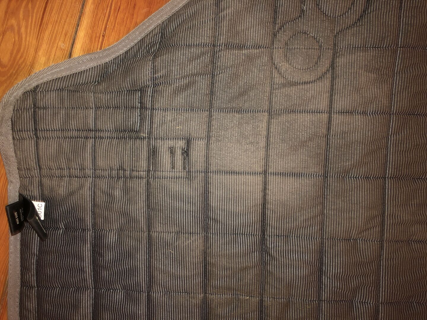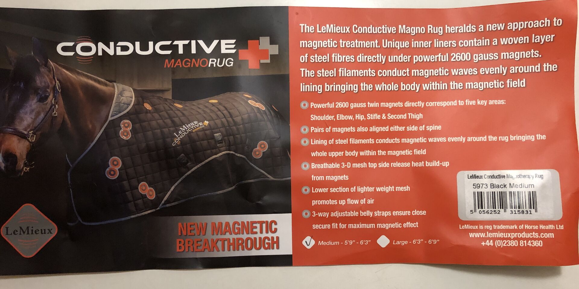 Magnetfältsmatta Ledande Magno-matta från LeMieux - Innerfodret innehåller ett vävt lager av stålfibrer direkt under kraftfulla 2600 Gauss dubbelmagneter. Effekt: -Främjar blodflödet till musklerna och uppvärmning före träning -Snabbare återhämtning efter träning -Förebygger ömhet och stelhet i musklerna -Förbättrad syretillförsel till vävnaden -produktion av elastin och kollagen, som är nödvändiga för utvecklingen av nya celler är viktiga för utvecklingen av nya celler. Storlek M, lite för lång för min ponny med 125 cm rygglängd, tror att 135 till 145 cm passar bra. I mycket gott skick, normala "kardborremärken" i kardborrefästområdet på bröstet.
