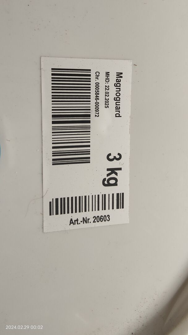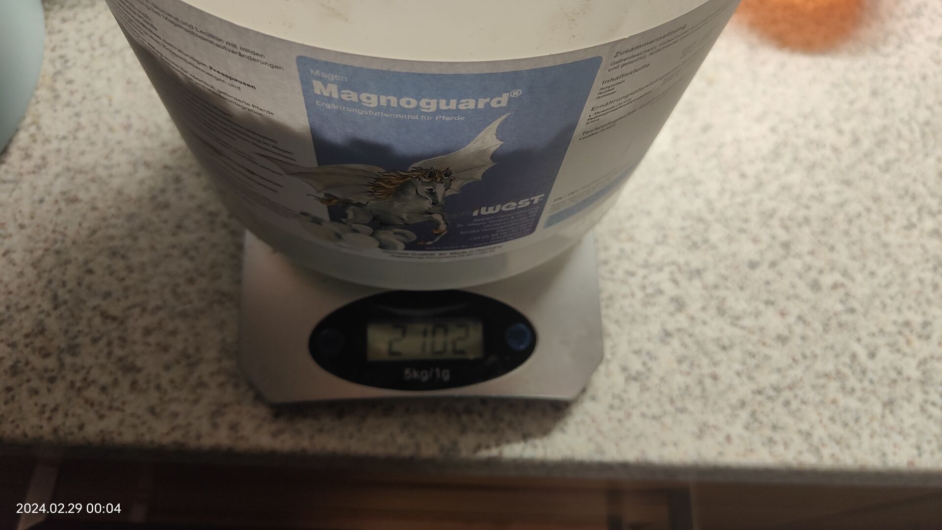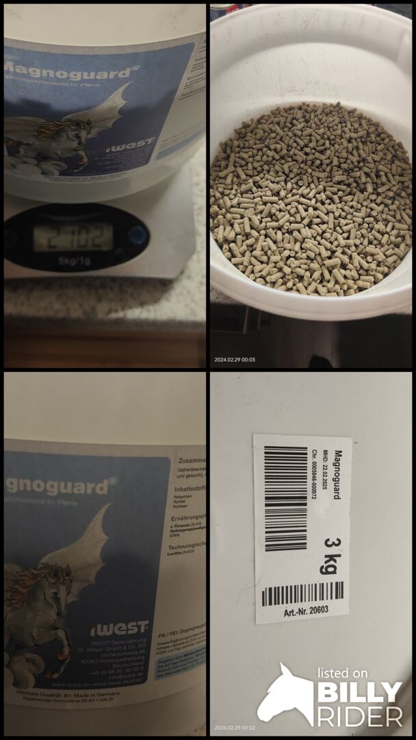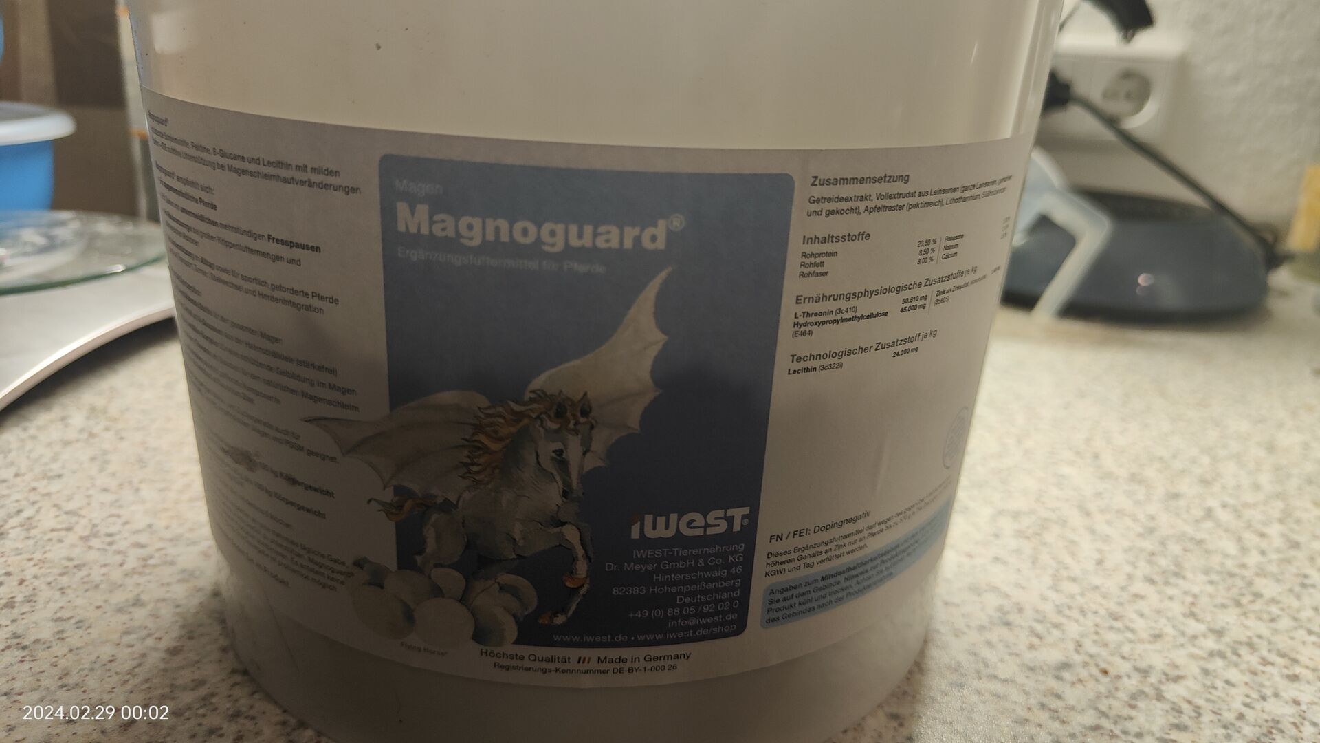 Jag erbjuder en hink med 2 KG Magnoguard. Mitt sto gillar inte smaken och det är för bra för att stå och slänga. Hinken har precis öppnats.