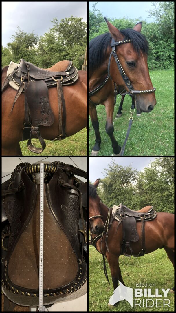Marchador sadel - nästan ny - handgjord - Denna sadel finns bara en gång på jorden. Handgjord. Super vackert dekorerad och har endast använts på två tävlingar. Den har några förvaringsspår men väldigt lite slitage. Innehåller även matchande träns, bröstplatta, grimma, halter, tyglar och ledarrep. Tyvärr har jag inte längre någon häst och måste nu avstå från denna fantastiska sadel på grund av platsbrist. Den passar nästan alla hästar utom mycket smala araber eller fullblodshästar.