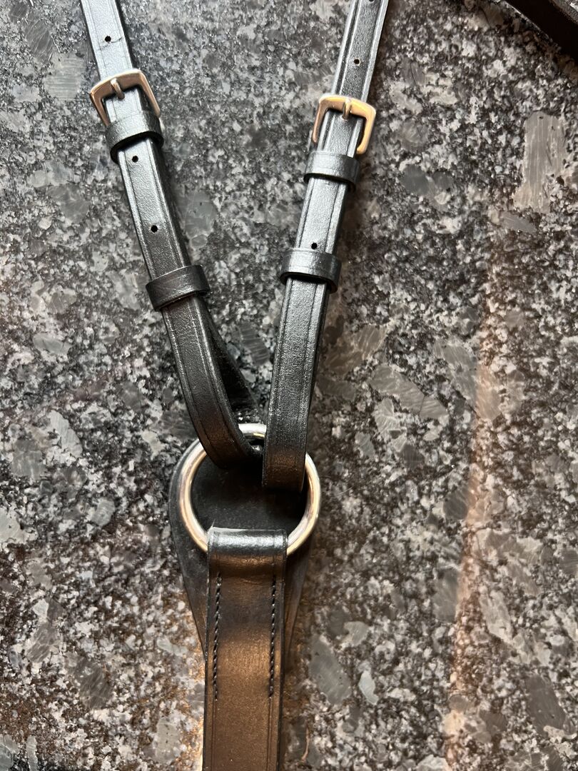 Jag erbjuder en oanvänd martingal i svart. Den beställdes två gånger av misstag och har aldrig använts. Den passar en COB och är perfekt för att arbeta med hästen för att stabilisera nacken och förbättra den allmänna ridkänslan.