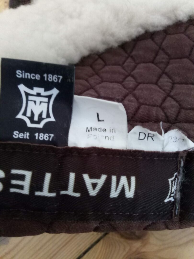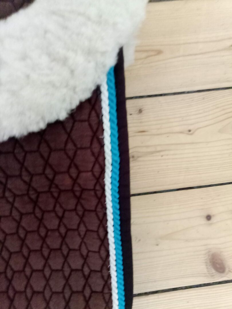 Mattes sadelunderlag av lammskinn storlek L - Mycket välbevarad och nyrenoverad lammskinnssadelunderlag från Mattes till salu. Sadelunderlaget är i mycket gott skick, lammskinnet är superfluffigt och har alltid rengjorts med det avsedda rengöringsmedlet. Det finns endast små spår av användning i området där omkretsen ligger. Tack vare den chokladbruna färgen är sadelunderlaget okänsligt för smuts. Den turkosa och vita sladden är diskret elegant.