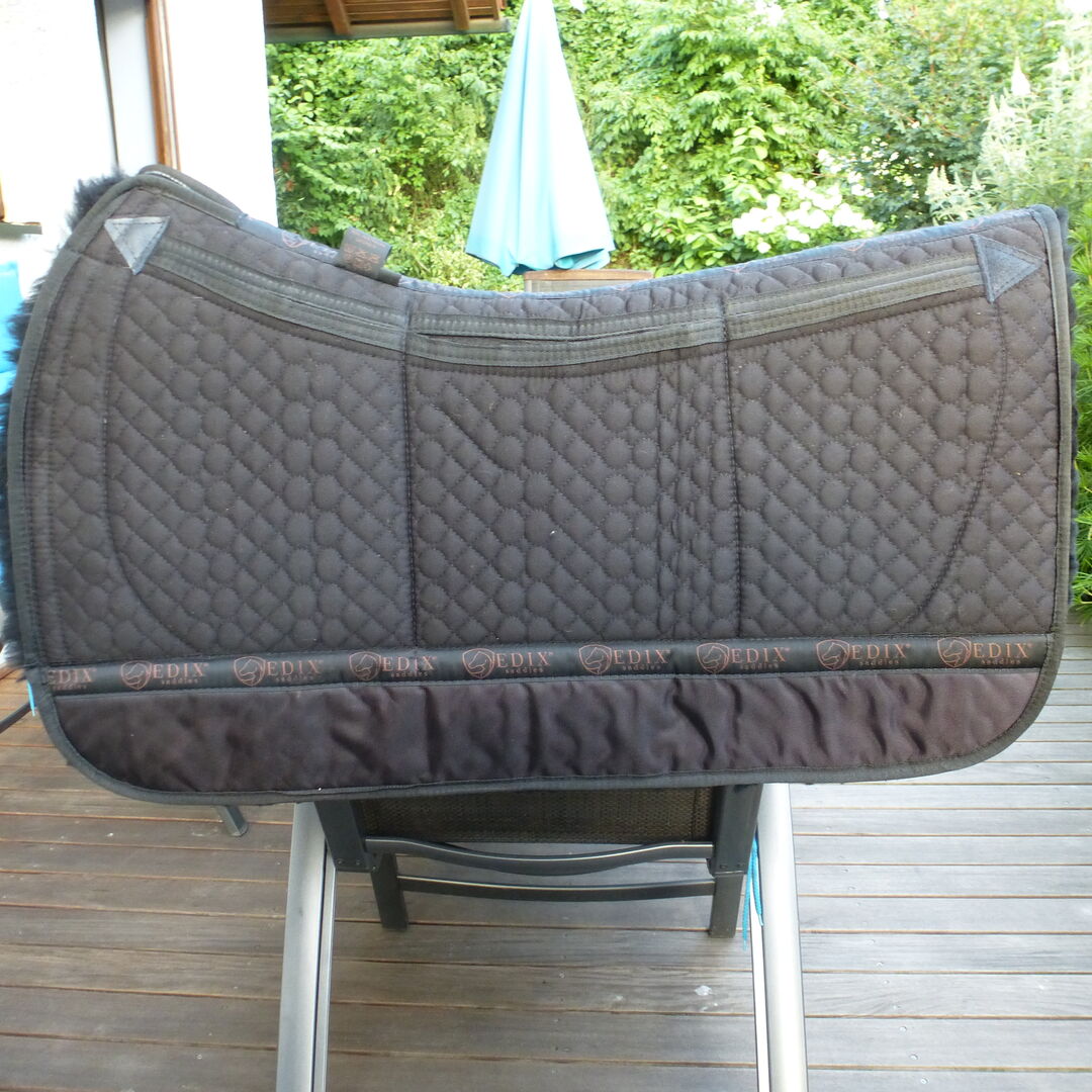 Mattes Westernpad Korrektionspad lammskinn - Edix Western pad lambskin trädlös Western Square av slitstarkt och mycket mjukt tyg som andas (100 % bomull) med äkta lammskinn på undersidan - ca 30 mm i sadelområdet, med reducerad nedskuren ryggkanal ca 10 mm. Åttafickors korrigerande tryckutjämningssystem med filtinlägg. Genomgående två långa inlägg (ca 9 mm) för de nedre stora fickorna. Samt sex mindre fickor (tre på varje sida). Hög manke och delad manksöm för ökad flexibilitet. Den 10 mm tjocka lammskinnsfyllningen i ryggkanalen är viktig för alla sadlar och särskilt för trädlösa sadlar, eftersom den kan förhindra skav, t.ex. i mankhöjd. TOP-alternativet passar för Freemax westernsadlar eller andra trädlösa westernsadlar. M: längd 71 cm (A-B rygg) / 75 cm (G-H mittplatta), höjd 37 cm (mittplatta), mankhöjd 45 svart, innersulorna ingår naturligtvis. Jag betalade 229 euro för den. Den var bara under sadeln i två timmar och är därför så bra som ny!