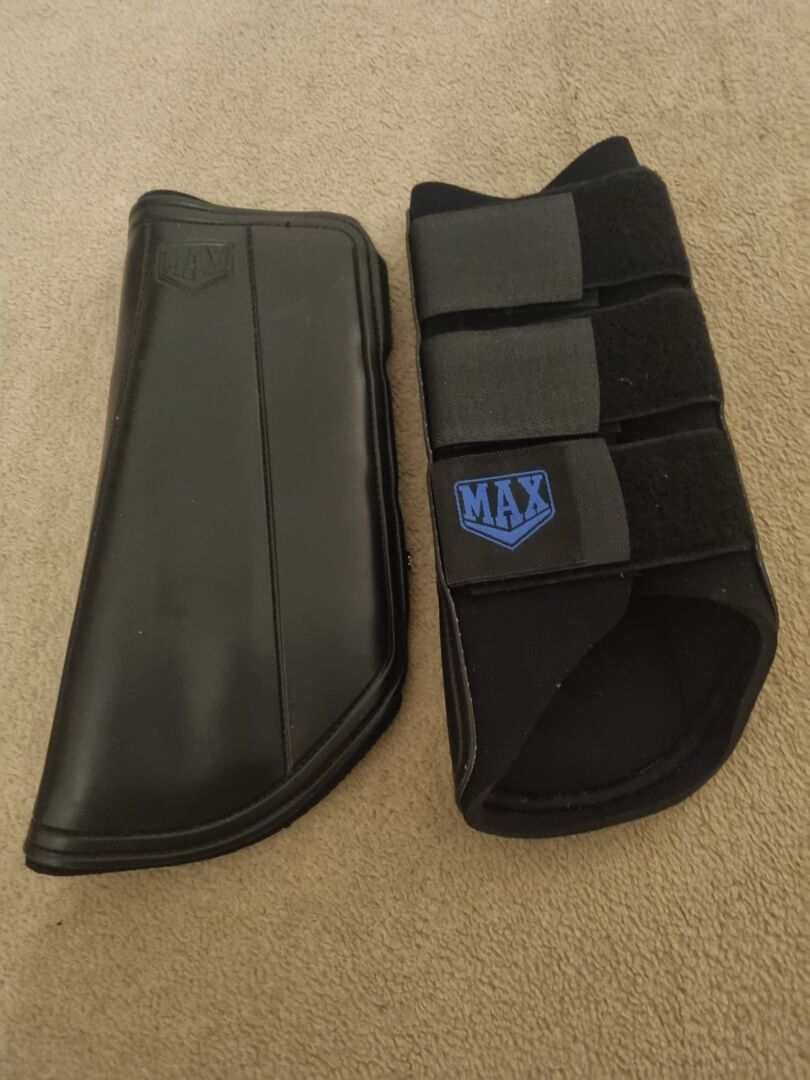 Horse hind black brushing boots. Tough Armatex outer, 7mm ultra dense neoprene with durable PVC striking pad. Double hook and loop fastening. Machine washable. Never used and only for sale as no longer have horses.