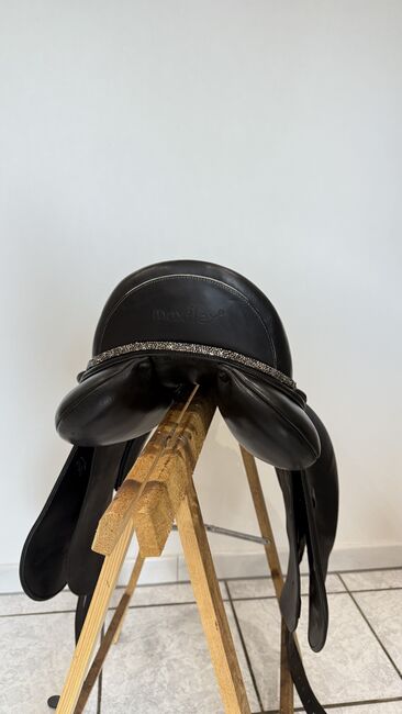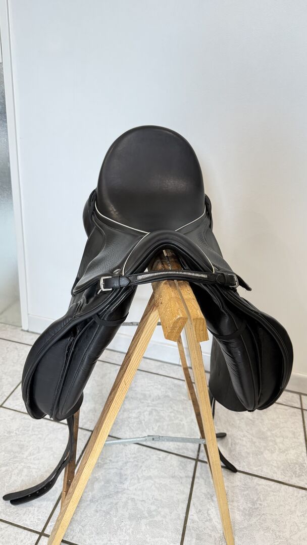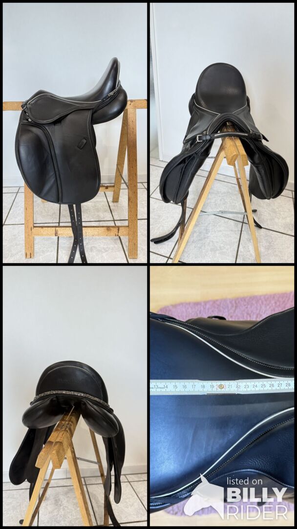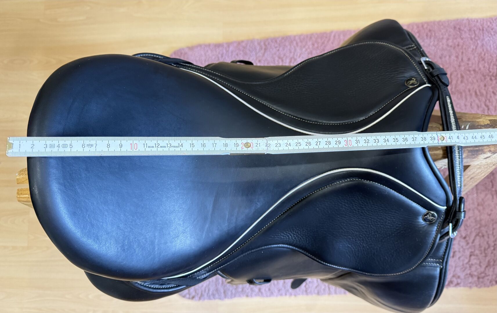 Sadeln imponerar med sitt eleganta utseende med exklusiva dekorsömmar och erbjuder förstklassigt stöd och komfort tack vare det dubbla kalvskinnet. Den har knappt använts och är därför i mycket bra, nästan nytt skick. Lädret är välvårdat, visar knappt några tecken på slitage och klädseln är fortfarande mjuk och jämn.