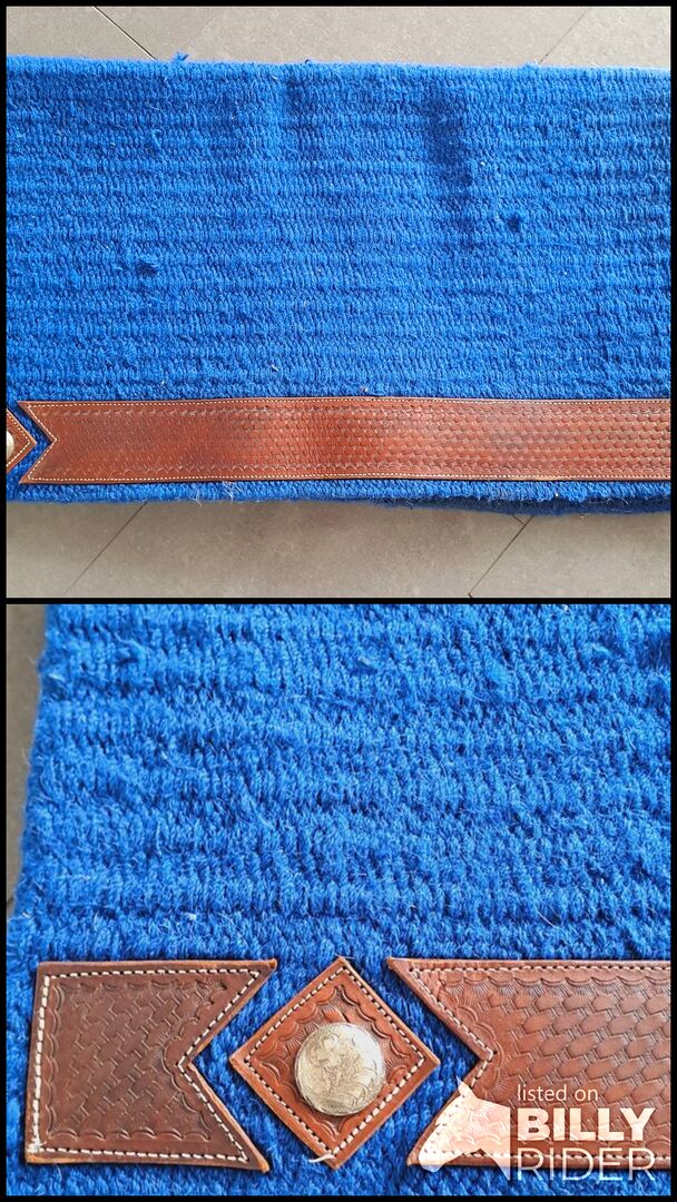 Mayatex, utställningsfilt, läderklädsel/silver, kungsblå - Användes 2x vid en turnering. Inte tvättad. Fortfarande vitt hår på den.