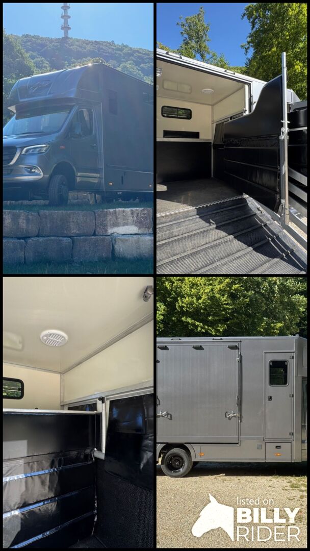 Mercedes-Benz 519 hästbox Unik!!! Fyrhjulsdrift 4x4 Självkörande - Lyxig 4x4 fyrhjulsdriven hästtransport från Dickenherr - komfort, säkerhet och prestanda i kombination. Upplev den perfekta följeslagaren för din hästtransport - en högkvalitativ Mercedes-Benz hästtransport med fyrhjulsdrift (4x4) som inte lämnar något övrigt att önska. Med en imponerande dragkapacitet på 3,5 ton och en kraftfull motor på 190 hk med en smidig 9-växlad automatisk växellåda är du perfekt utrustad för alla typer av transporter - oavsett om det är på asfalt eller grusvägar.Förar- och passagerarkomfort på högsta nivå- Fin läderinteriör inklusive läderratt
