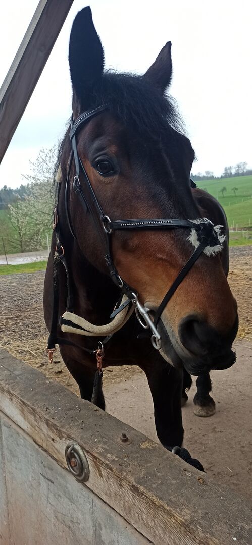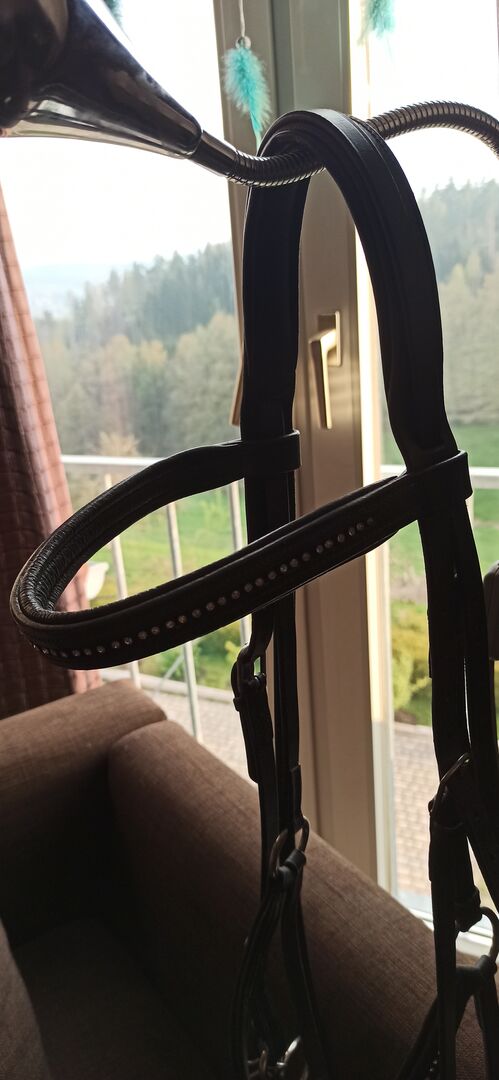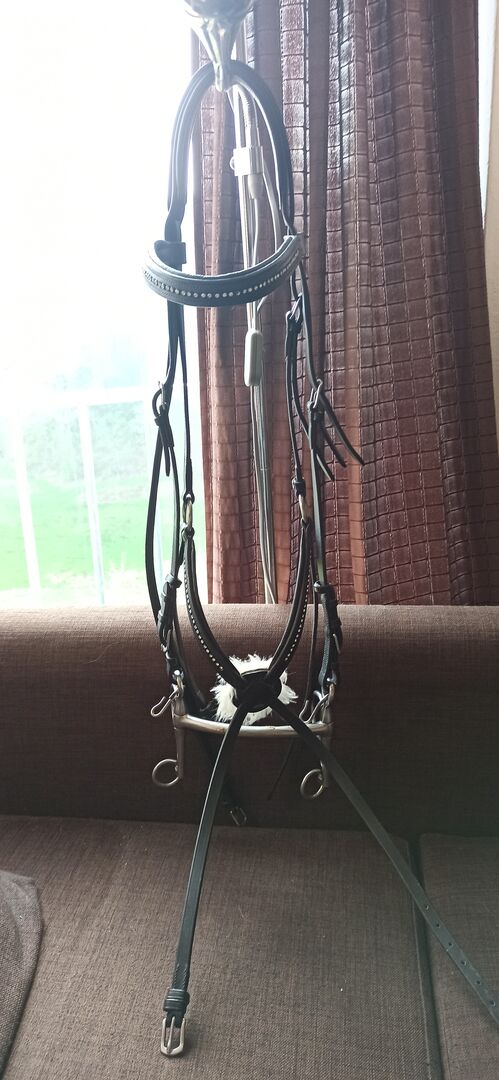 Mexikanska Caveson Snaffle Rhinestone Coldblood XFull som ny - Jag erbjuder en svart läderträns med strass på pannbandet och nosbandet för stora huvuden utan bett. Den har bara suttit på hästen en gång för en provning, tyvärr passar den inte perfekt. Halsbandet är mjukt vadderat och det finns vit plysch på nosbandet.