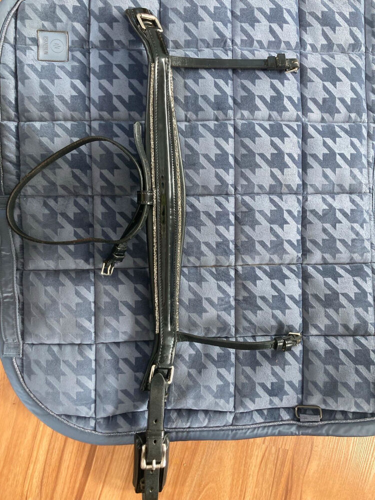 Mint nosband nosband av Schumacher - Topprenoverad nosgrimma från Schumacher till salu. Lack och fineline. Mycket högt nypris! Storlek WB Bredd 5cm och komfortvaddering. Passar till Tokyo, Venice etc. och alla träns där nosgrimman är spänd på båda sidor.
