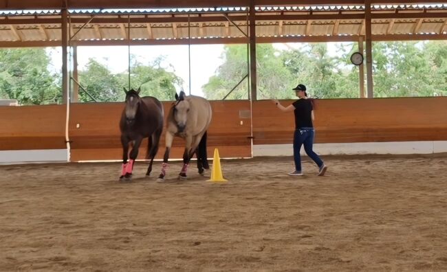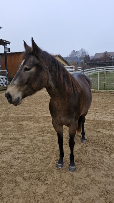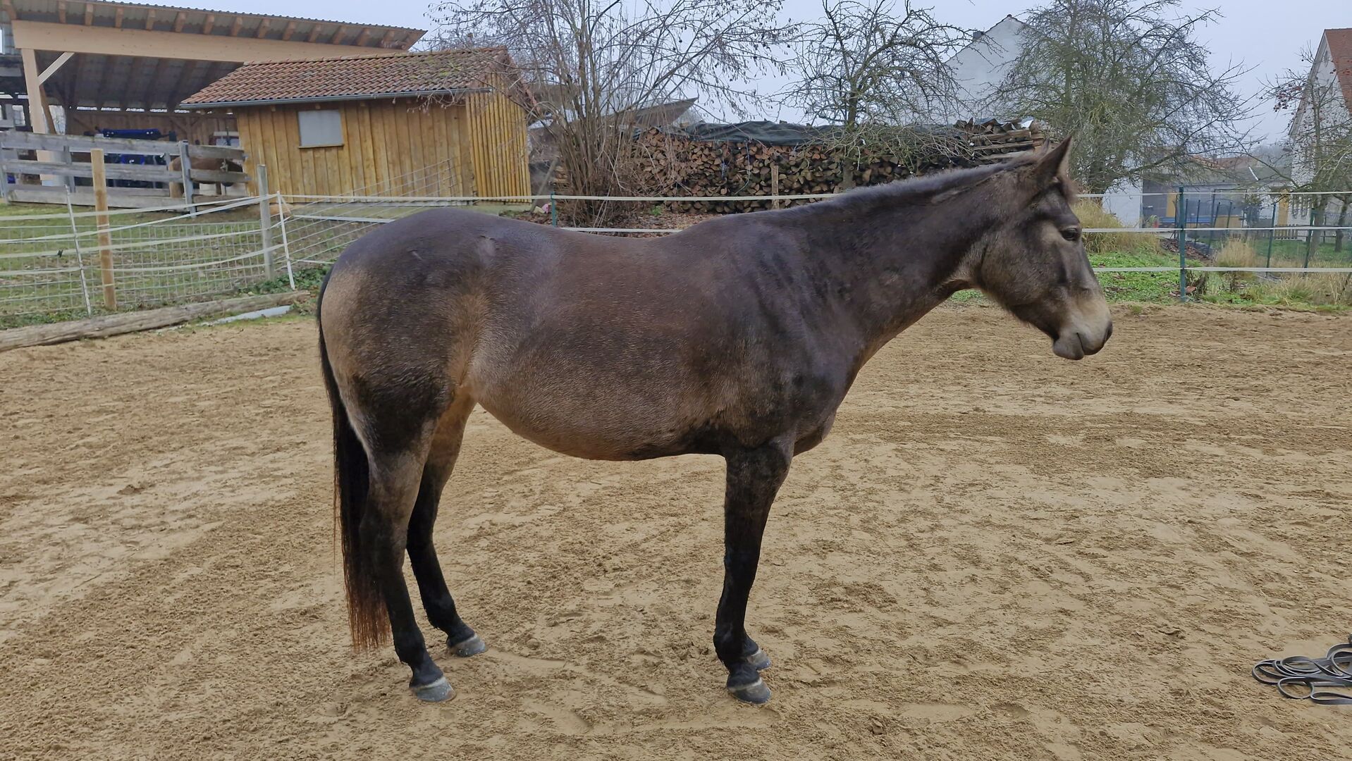 Miss Sinny Bar - vackert Quarter Horse-sto med potential - Plats: 85122 Hitzhofen Miss Sinny Bar - ett buckskinfärgat Quarter Horse-sto född i juni 2021 med en höjd på ca 150 cm. Hon har en elegant, atletisk byggnad och är inte en tungviktare, men imponerar med sin harmoniska utveckling och naturliga atletism. Trots en trasig ryggradsprocess vid två års ålder, som enligt veterinären har läkt helt, är hon nu frisk, helt motståndskraftig och rids regelbundet. Veterinären är gärna tillfrågad. Hon är 5-panel n/n via sina föräldrar, regelbundet vaccinerad, avmaskad och kontrollerad av tandläkare, går barfota och har alltid varit under professionell sadelkontroll. Hon bor för närvarande i ett öppet stall med höförsörjning dygnet runt och tillgång till betesmark, där hon rankas högt inom flocken. Hon är en mycket snäll, människovänlig och gosig häst som också är viljestark, nyfiken och ibland lite otålig. Hon vill alltid vara till lags, lär sig snabbt och är mycket ivrig och öppen för nya uppgifter. Eftersom hon fortfarande ifrågasätter mycket och behöver ett tydligt och rättvist ledarskap är hon inte en nybörjarhäst. Miss Sinny Bar har tränats försiktigt och mångsidigt enligt Pro-Ride-konceptet. Hon skrittar, travar och galopperar tryggt i ridhuset och är pålitlig när det gäller att gå ut ensam eller i grupp. Hon är särskilt begåvad i fritt arbete samt mark- och longeringsarbete. Tack vare sin mycket goda reiningstamtavla (Einsteins Revolution x Bueno Swiss Doc) är hon inte bara intressant som unghäst för ambitiösa fritidsryttare, utan även för avel i framtiden. Den matchande sadeln kan köpas på begäran. Eftersom detta inte är en nödförsäljning läggs stor vikt vid att hitta ett lämpligt hem där detta begåvade sto kan vidareutvecklas och hållas upptagen på ett varierat sätt. Miss Sinny Bar har allt man kan önska sig av en ung, motiverad häst som vill växa tillsammans med sin ägare.