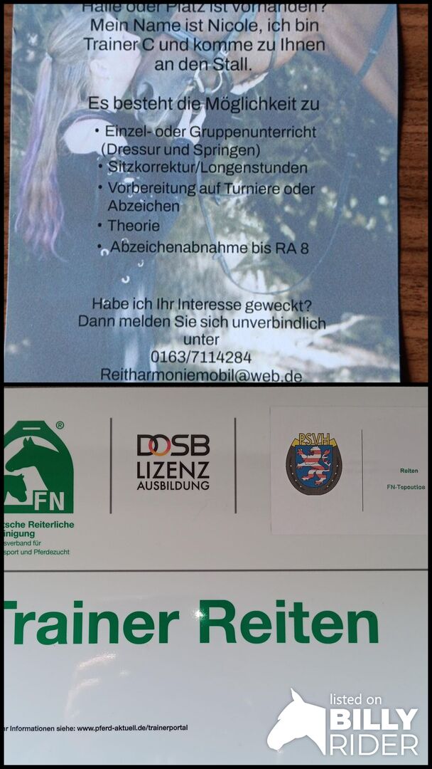 Mobila ridlektioner - Letar du fortfarande efter en tränare? Har du en inomhusarena eller arena tillgänglig och kan du använda den för lektioner? Jag är en tränare C och kommer till ditt stall. radie 30km Plz 36151 Enstaka lektion 40 euro eller små grupper 20 euro per ryttare möjligt Dressyr och hoppning, efter överenskommelse även tävlingscoaching