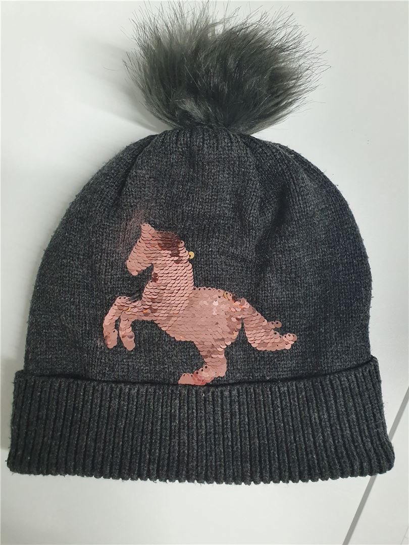 Mössa med paljetthäst - Så gott som ny mössa för flickor i mörkgrått med paljettmotiv av hästar.