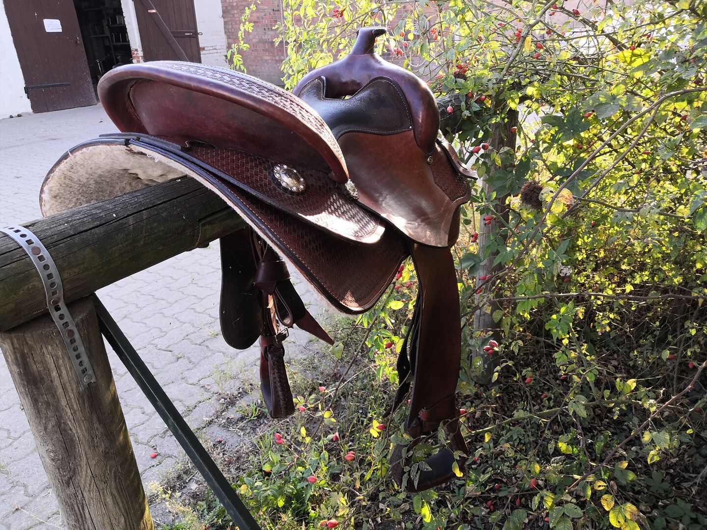Montana Western Saddle mörkbrun - Jag säljer min vackra begagnade western-sadel eftersom den har blivit för trång för min Haflinger. Den är välskött och inte lika tung som andra sadlar.