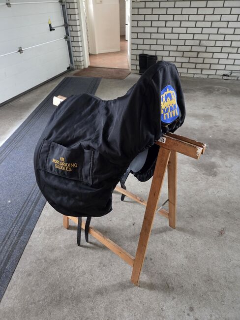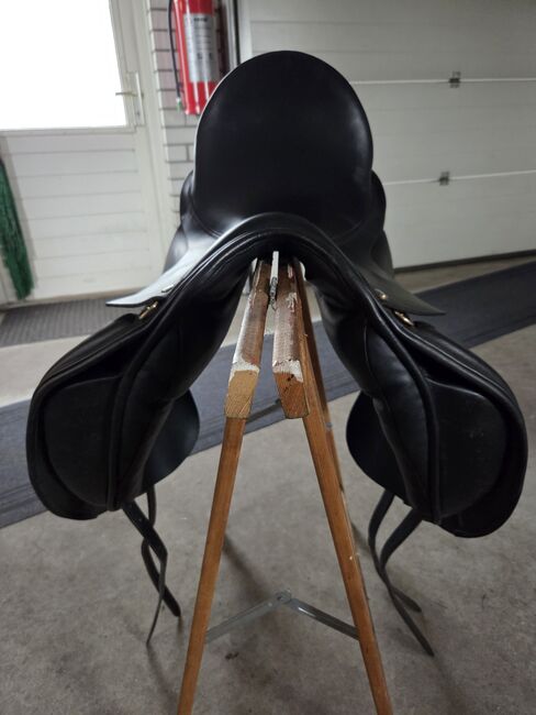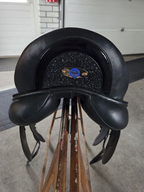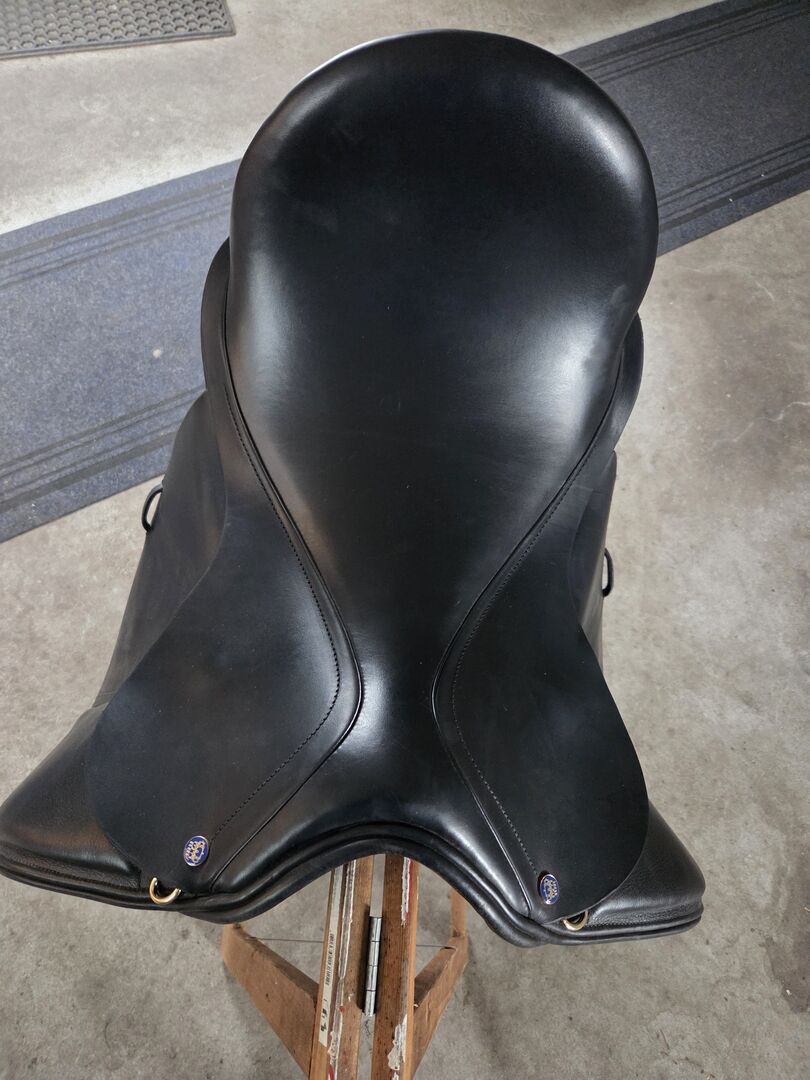 Denna dressyrsadel har en bred bomstorlek, som kan göras smalare vid behov.