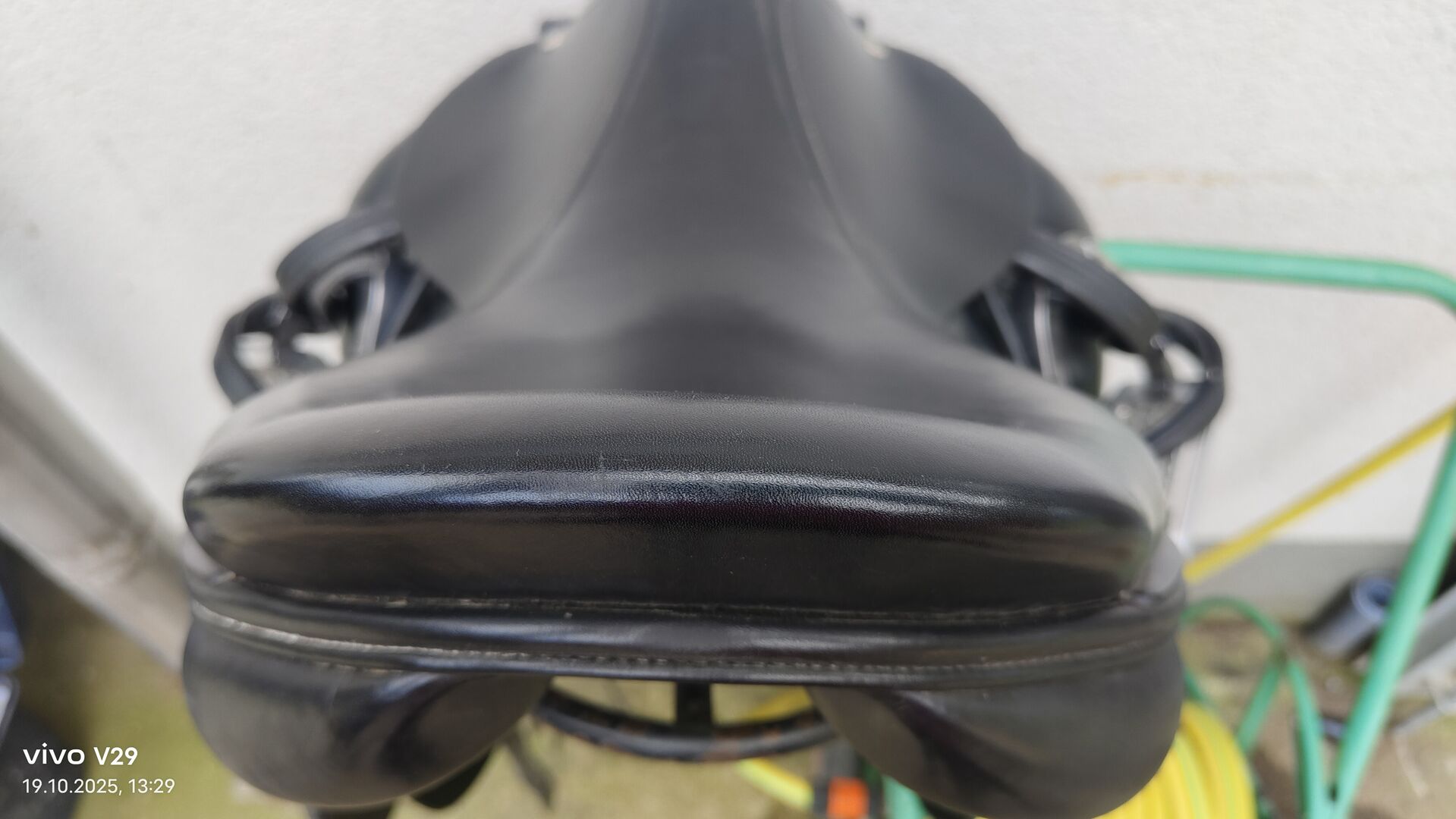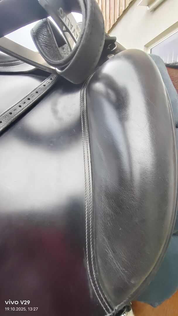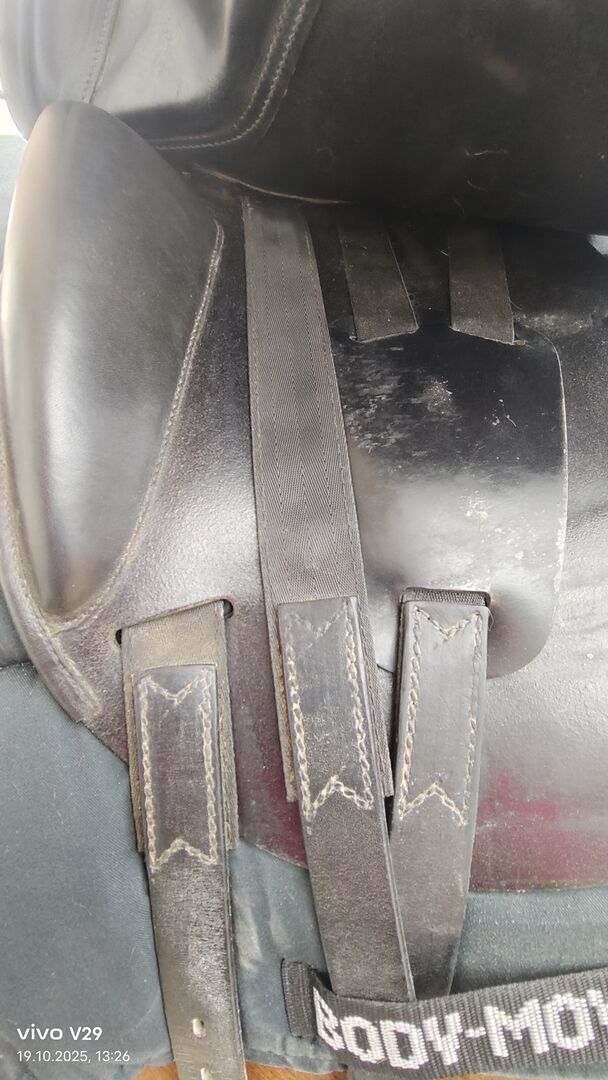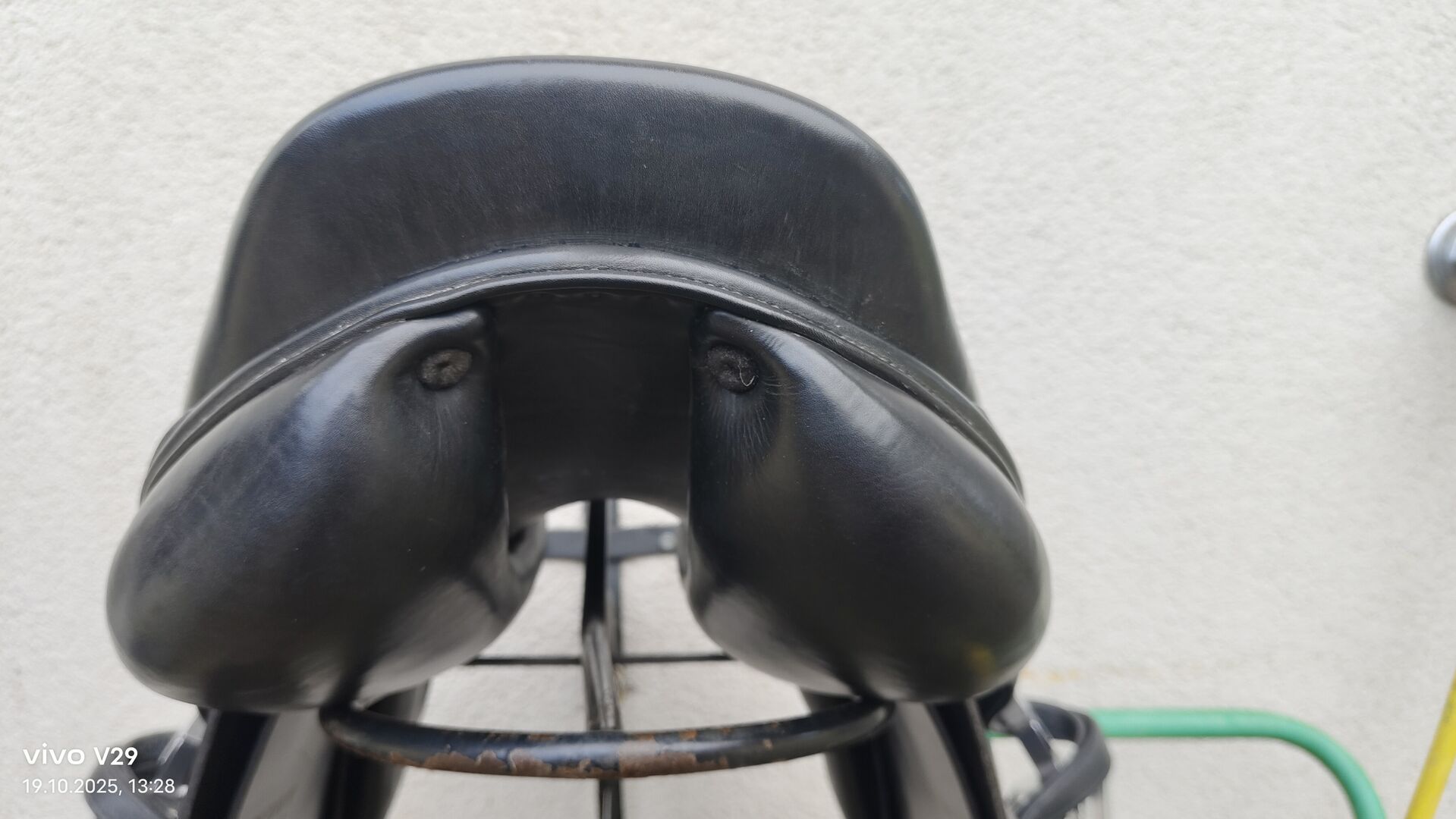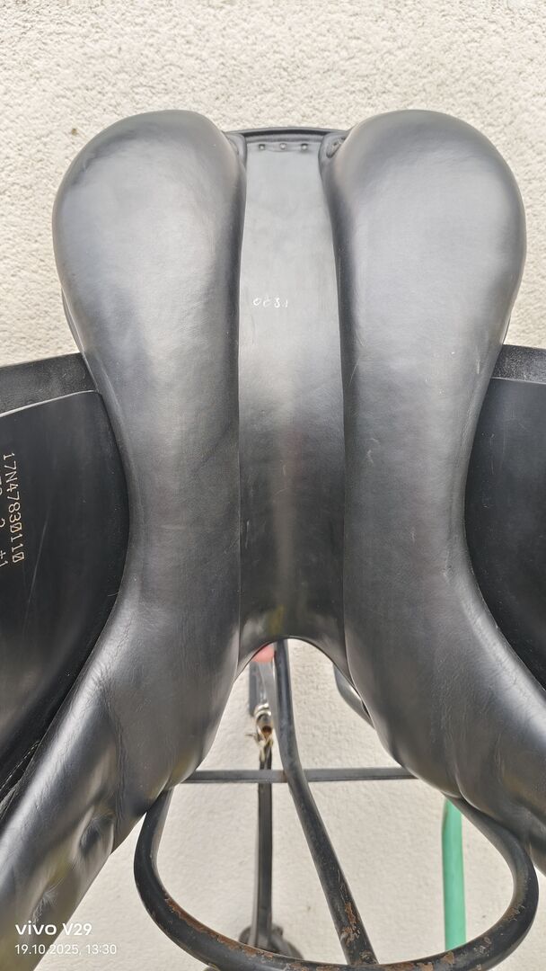Mycket fin klassisk dressyrsadel av märket Amerigo 17" i toppskick - Mycket fin, klassiskt skuren dressyrsadel från Amerigo, svart läder, 17" sits, halvdjup sits för rörelsefrihet i bäckenet. Mjukt vadderat säte och knäveck, sadelklaff av fast kalvskinn. V-gjutning, spikgjutning och gjutplatta finns. Sadeln är i utmärkt, mycket välvårdat skick! Minimala tecken på användning, inget slitage, sits, kant, pommel i tiptop skick, utan repor, nötning etc. Även sadelklaffarna visar inga verkliga tecken på slitage. Även sadelklaffarna visar inga tecken på slitage. Panelerna är mjuka, vadderade med ull. Bananpaneler, fransk fjädring. Sadeln är därför lämplig för korta hästryggar, något stigande ryggar med ganska låg mankhöjd. Tyvärr passar den inte riktigt oss, så vi säljer den. Priset är VB! Frakt och överlämnande möjligt i Salzburg-området upp till Golling och Freilassing, transport till Kärnten, Traunstein, Passau kan också organiseras!