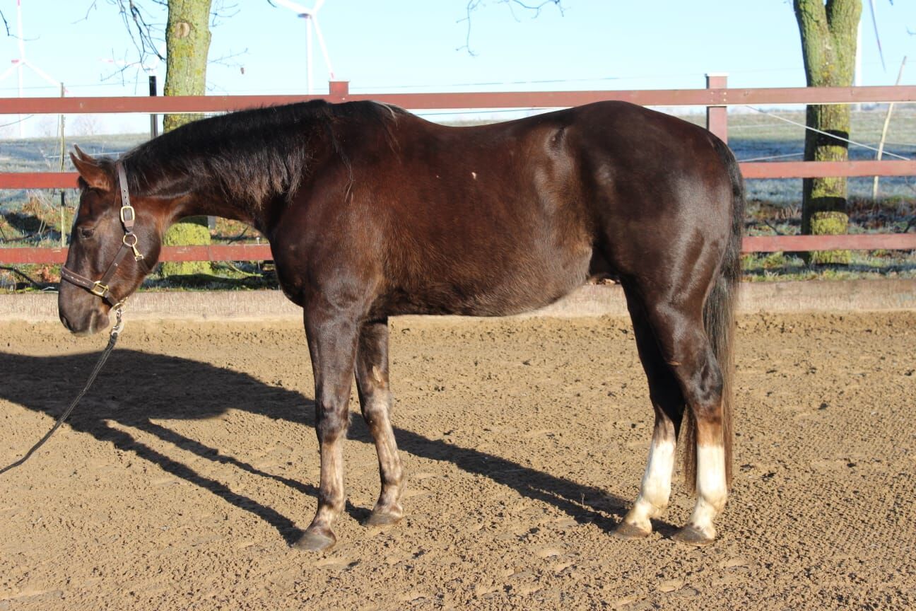 Mycket kär Quarter Horse-valack efter Shiners Voodoo - Plats: 18236 MJ Voodoo In Samr - denna vackra, stora Quarter Horse valack, född 2020 med en höjd av 154 cm, är helt enkelt en skatt. Han är supersöt, lugn och folkorienterad. Väluppfostrad och okomplicerad att hantera och under sadel. Därför också lämplig för nybörjare. Han är frisk och hälsosam och känner till box- och öppen stallhållning samt 24/7 betesmark på sommaren. MJ har en gedigen westernutbildning och har börjat tränas i reiningmanövrar. Han har ännu inte visats. Valacken är lätt att rida, oavsett om det är inomhus, utomhus eller på fältet. Hans stamtavla får hjärtat att slå snabbare hos varje reiningfantast. MJ:s far är Shiners Voodoo (uppfödd av Shining Spark/Hollywood Dun It). Valackens mamma är en Einsteins Revolution-dotter. Denna skatt letar efter ett 5-stjärnigt hem där han kan bli en familjemedlem.