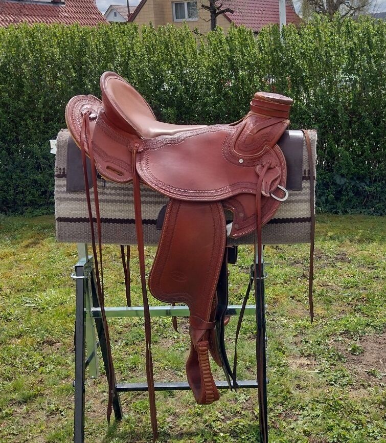 Vi köpte denna vackra sadel till vår Haflinger 2018. Det nya inköpspriset var 3 600 euro. Sadeln är från tillverkaren Le Selle Italiane och säljs normalt endast via en återförsäljare/sadelmakare. Efter en lång skadeperiod och motsvarande kroppsförändringar passar sadeln tyvärr inte längre. Sadeln har alltid behandlats med omsorg, använts lite och är därför i mycket gott skick. Det finns inga större skador, endast lätta tecken på användning. Dessa är dokumenterade på bilderna.