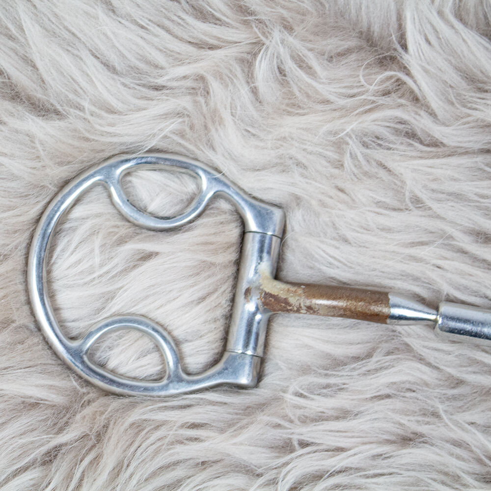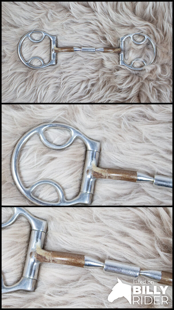Myler Western Dee med grommets MS.02 14cm - Den här D-ring komfortvattentränan är utformad för westernhästar och är avsedd att stimulera tuggaktivitet. I mitten av bettet finns ett flexibelt rör som kan rulla försiktigt på tungan, men som också kan bygga upp ett visst tryck. Bettet har en kopparinsats och är tillverkat av sötjärn som rostar för att stimulera salivation. Den är 14 cm stor. Biten är i gott skick. Den har börjat rosta på vissa ställen. To the seller's offerlaunch