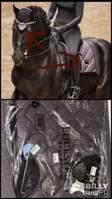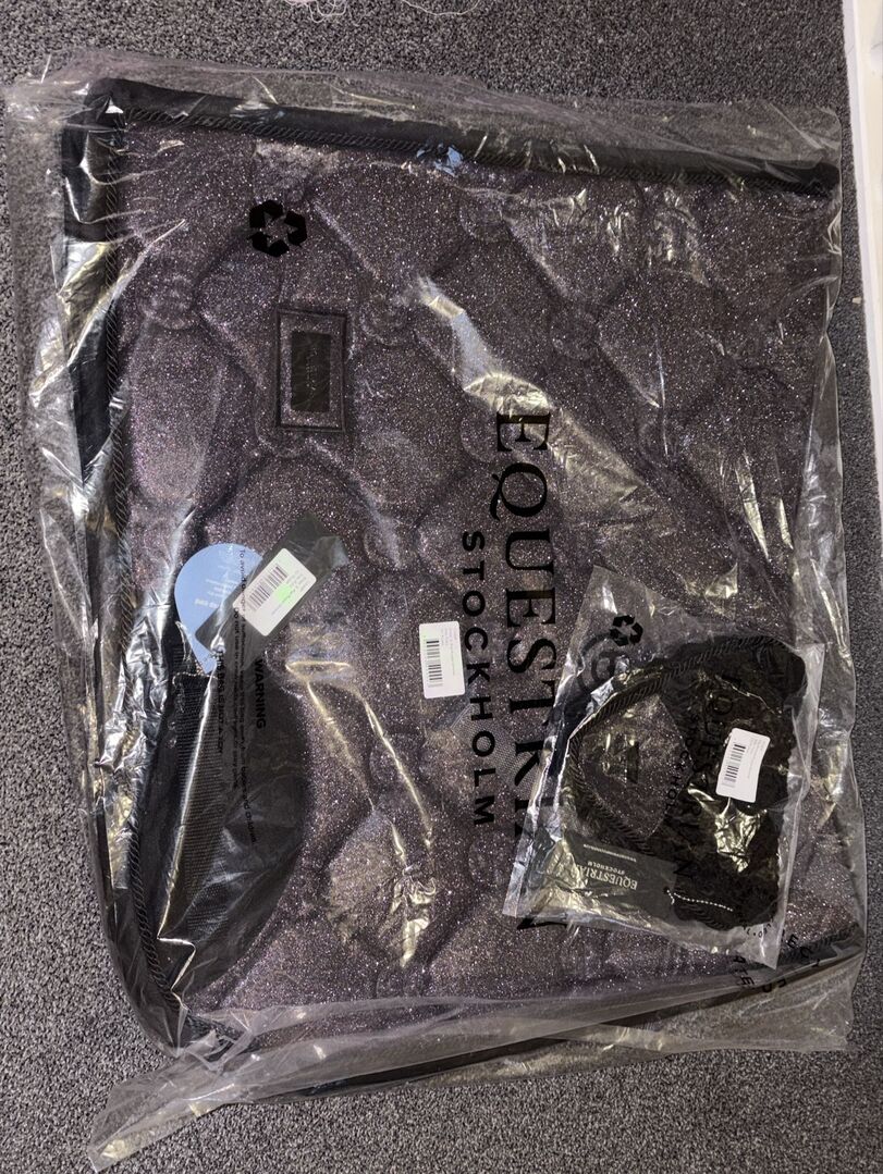 NEW OVP Equestrian Stockholm Set Lila Glimmer Sadelskydd Huv - Jag säljer mitt nya och fortfarande förpackade Equestrian Stockholm Glimmer Purple Set. Schabraket är i dressyr, kåpan i varmblod/full :)