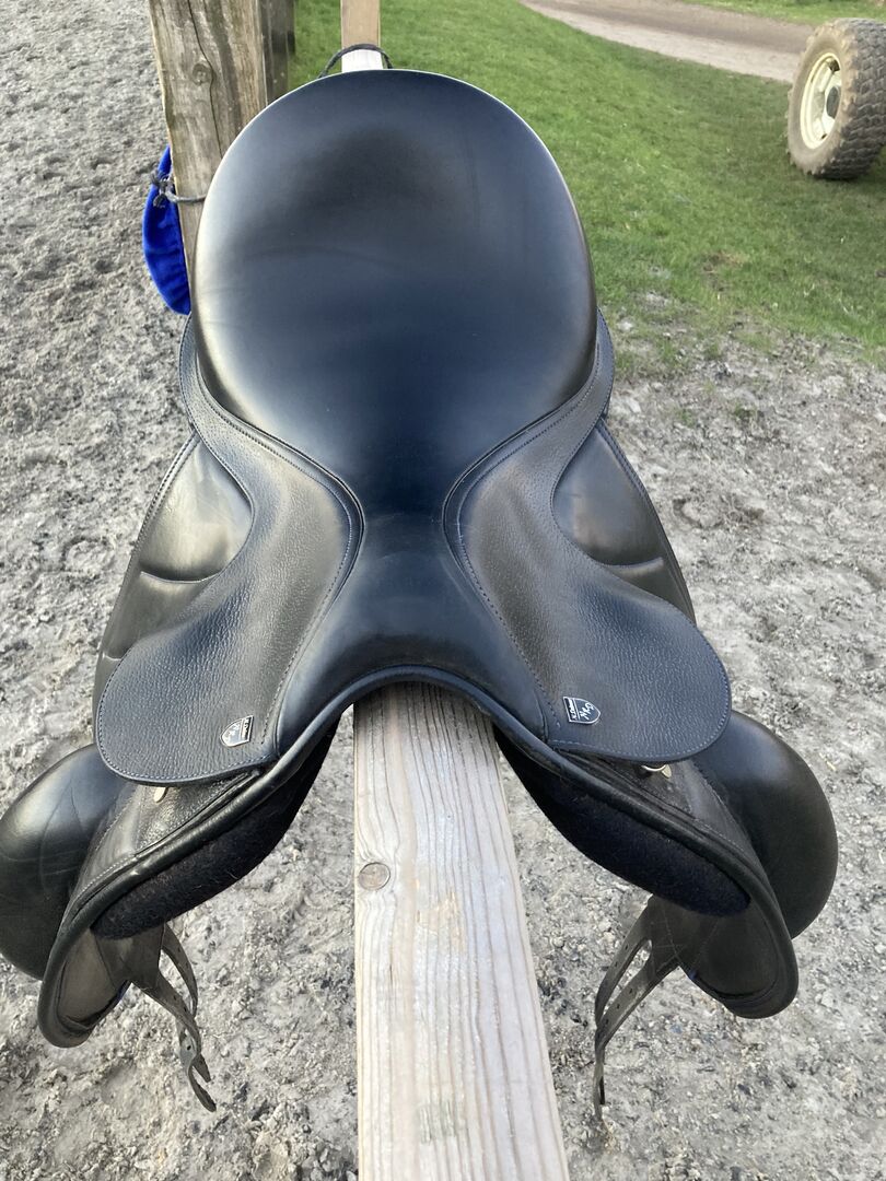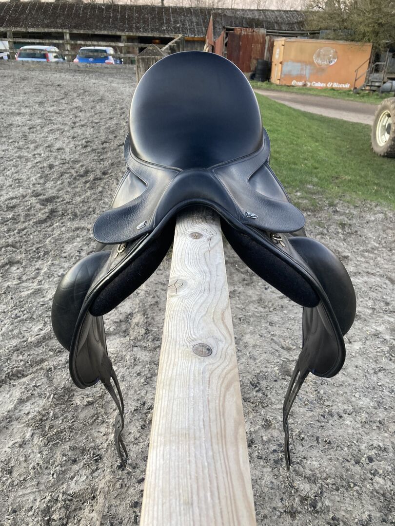 17.5 in black nick dolman monoflap dressage saddle mw. Serge panels, very lightweight, excellent condition and well looked after. Can be widened to a wide or narrowed to a medium.