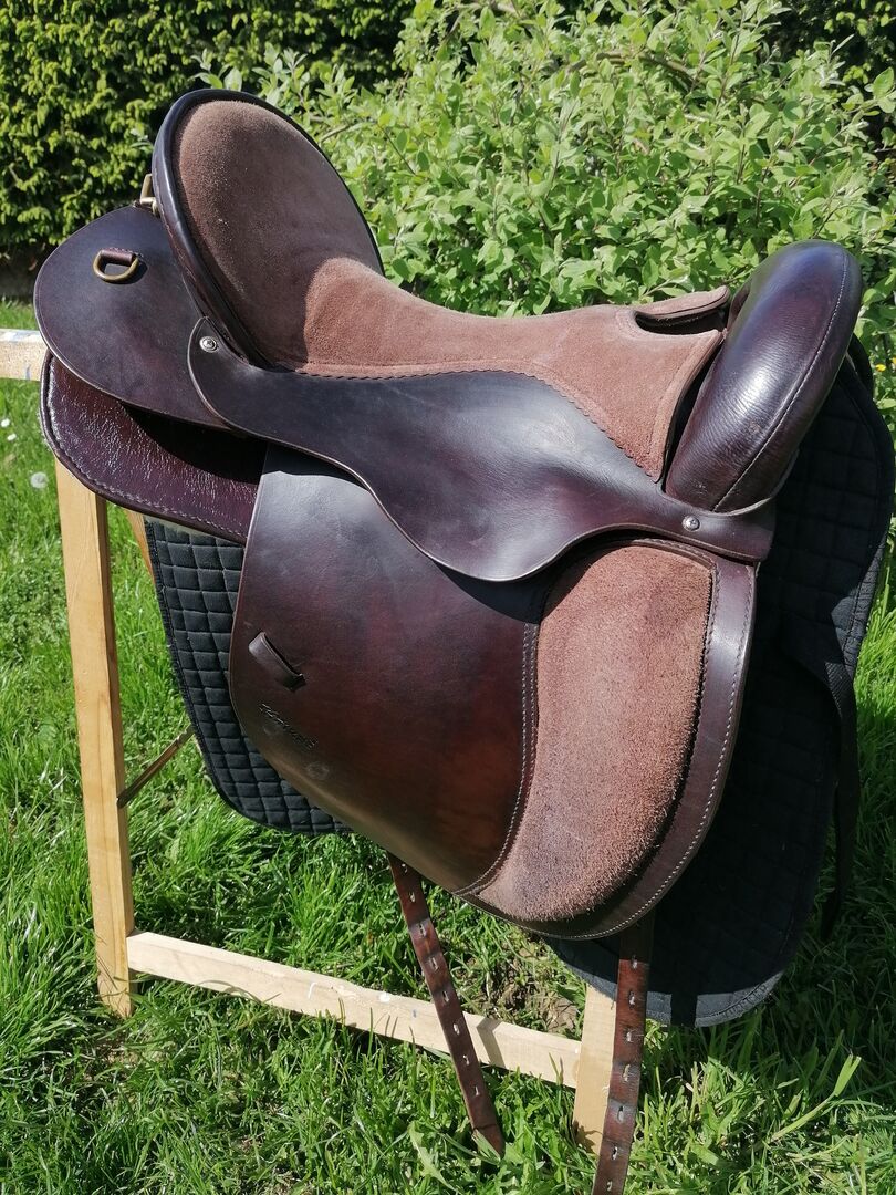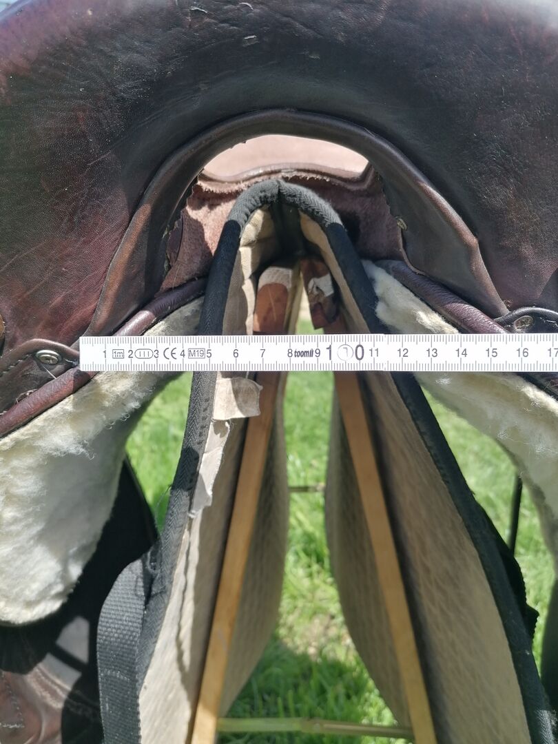 Sadeln är begagnad och har normala slitage, men är mycket välskött. Sitsen och pommlarna är gjorda av mocka och är också i gott skick. Den breda läderklädda gaffeln är gjord av plast och det finns en lös del inuti, men det påverkar inte funktionen.